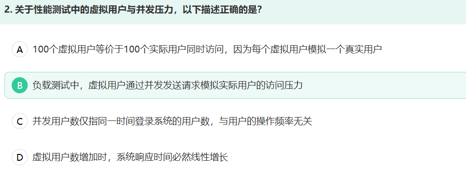 选项A错误,因为100个虚拟用户不一定等价于100个实际用户同时访问;虚拟用户可能未模拟真实用户的思考时间(Think Time),导致请求更密集,从而可能产生高于实际用户的负载。选项C错误,因为并发用户数不仅包括登录系统的用户,还包括同时执行操作(如发送请求)的用户,且用户的操作频率会影响并发负载的强度(如高频操作会增加并发压力)。选项D错误,因为系统响应时间的增加不一定是线性的;在系统资源瓶颈(如CPU或内存耗尽)时,响应时间可能指数增长或趋于饱和。