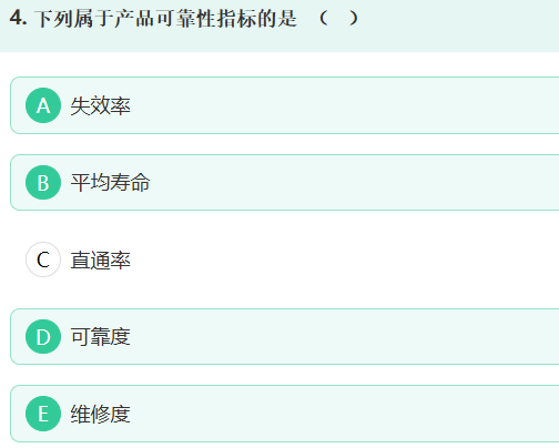 在产品可靠性工程中,可靠性指标是衡量产品质量和性能的重要参数。ABDE都是典型的可靠性指标: