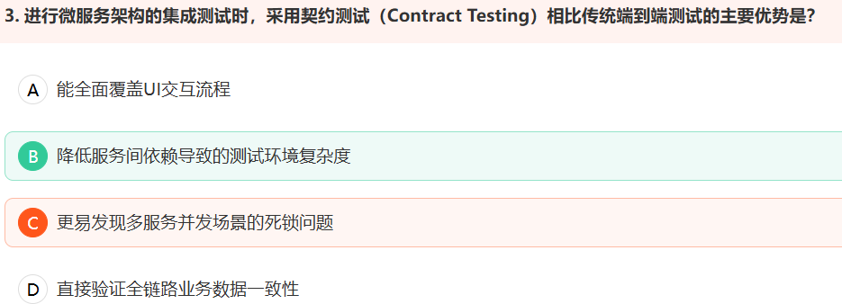 契约测试的主要优势是降低服务间依赖导致的测试环境复杂度,因为它通过模拟服务接口依赖,允许独立测试每个服务,而无需部署整个系统。选项A错误:契约测试专注于服务间接口,不覆盖UI交互流程(端到端测试更适合此目的)。选项C错误:契约测试不直接涉及并发执行,因此不易发现死锁问题(并发问题更适合集成测试或端到端测试)。选项D错误:契约测试验证点对点接口契约,而非全链路业务数据一致性(端到端测试更适合验证全链路数据)。