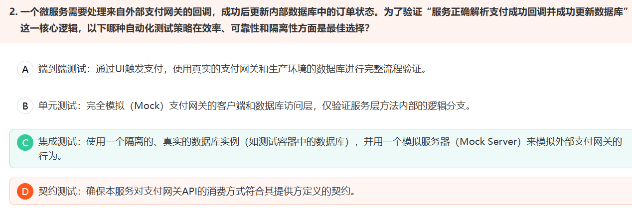 题目测试核心逻辑是验证服务解析支付成功回调并更新数据库,需要兼顾效率、可靠性和隔离性。选项分析:A(端到端测试)效率低(涉及完整流程和真实网关)、可靠性不稳定(依赖外部系统)、隔离性差;B(单元测试)效率高、隔离性好,但可靠性不足(完全mock外部依赖,可能遗漏集成问题,如数据库操作);C(集成测试)使用隔离的真实数据库实例(如测试容器)和mock server模拟支付网关,能直接测试解析回调及数据库更新,效率较高、可靠性好(真实数据库交互)、隔离性强;D(契约测试)只验证API消费符合契约,不直接测试核心逻辑(解析及数据库更新)。因此C在效率、可靠性和隔离性上综合最佳。
