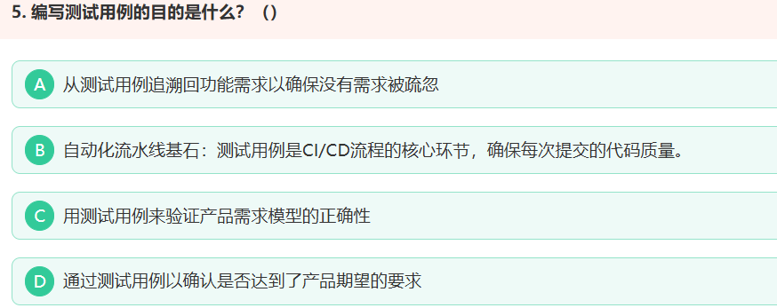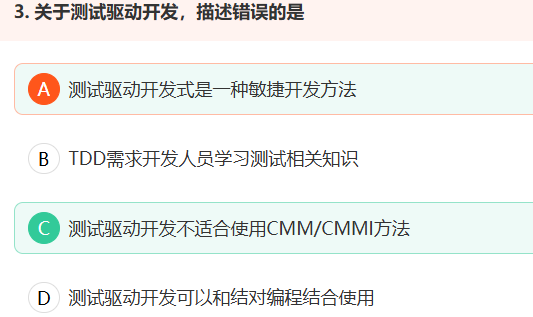 解析:TDD(强调实践和快速迭代)和CMM/CMMI(强调过程管理和文档)在理念上确有不同,但并不能说TDD“不适合”或“不能”在CMMI框架下使用。它们可以结合,只是侧重点不同。