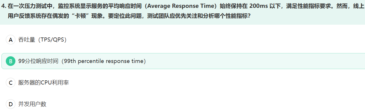 平均响应时间在200ms以下但用户反馈偶发卡顿,表明响应时间分布不均匀,存在少数高延迟请求。99分位响应时间(99th percentile response time)度量最慢1%请求的延迟,是诊断尾部延迟问题的关键指标,优先关注该指标可有效定位卡顿问题。其他指标如吞吐量(TPS/QPS)、CPU利用率和并发用户数虽可能影响性能,但不直接解释偶发卡顿现象。