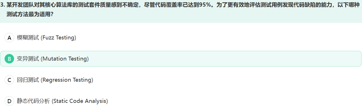 | 变异测试 | 测试用例集的有效性 | 动态(通过对变异代码运行时) | 评估测试套件的质量和完善度 | 不直接找程序bug,而是找测试的弱点 |