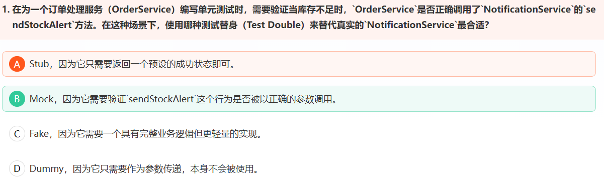 Ⓐ Stub(应答机):我安排一个工作人员坐在B的座位上,他只会机械地回答:“好的,收到”。他能让程序不报错,但他不会记录A是否举过手。测试结束后,我问这个工作人员:“A举手了吗?”他回答:“我不知道,我的任务只是说‘好的’。” (无法验证行为)