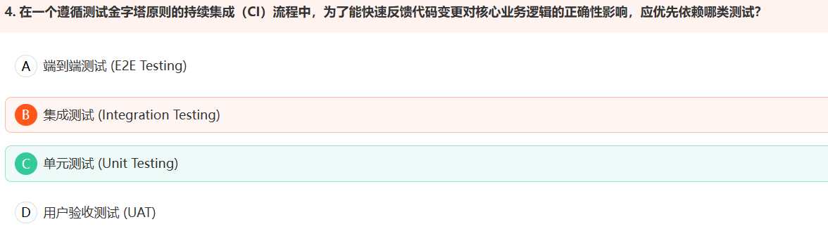 在测试金字塔原则中,单元测试(Unit Testing)位于最底层,执行速度快、成本低、反馈迅速,能直接验证代码单元的核心业务逻辑。持续集成(CI)流程中快速反馈代码变更的影响,应优先依赖单元测试。