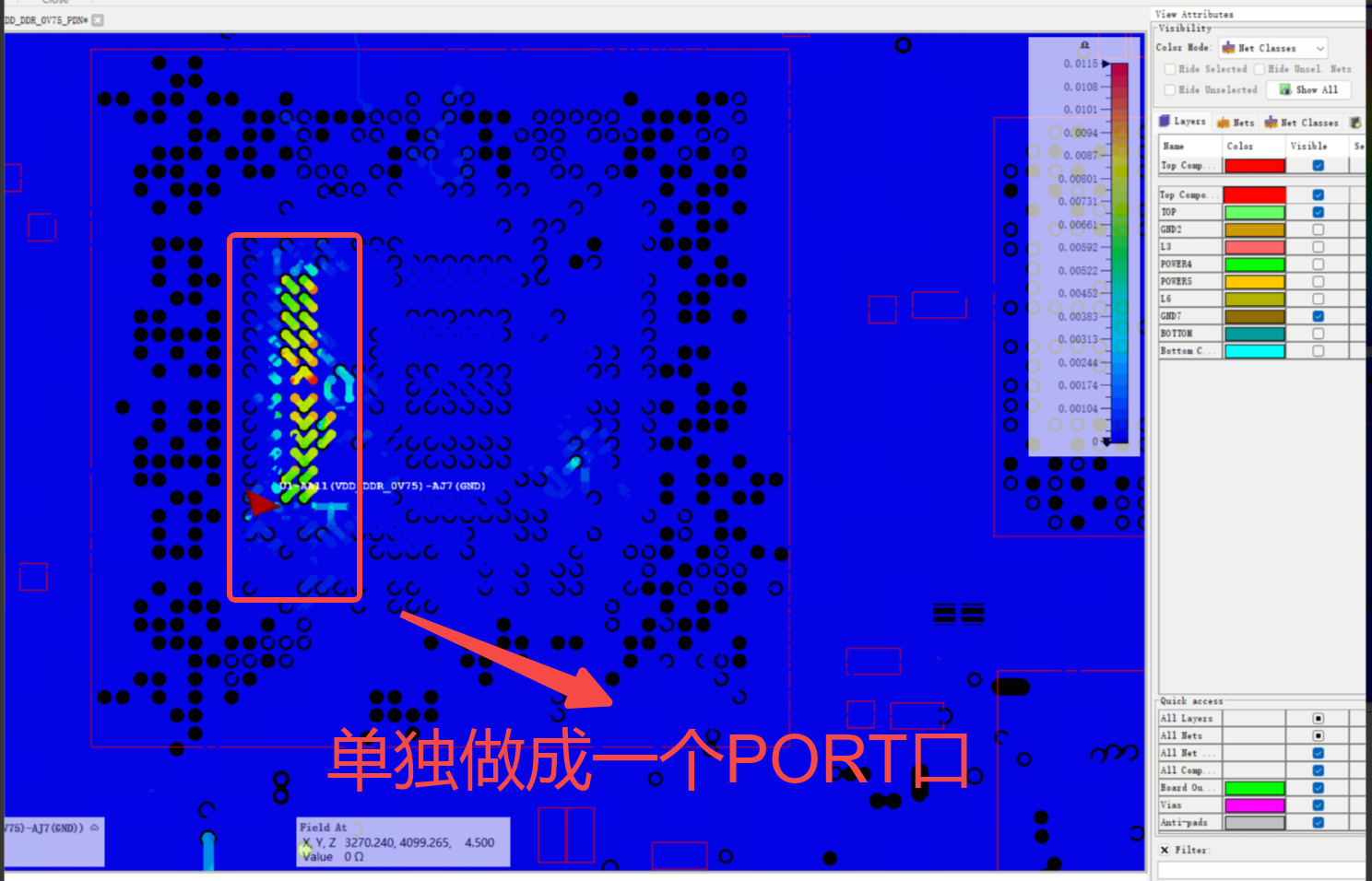 二,接着小编我又重新仿真去分析一下,但是记得这次是需要把VDD_DDR_0V75这个网络分成两个PORT去分析了,我们先看左边的VDD_DDR0N1这组。
