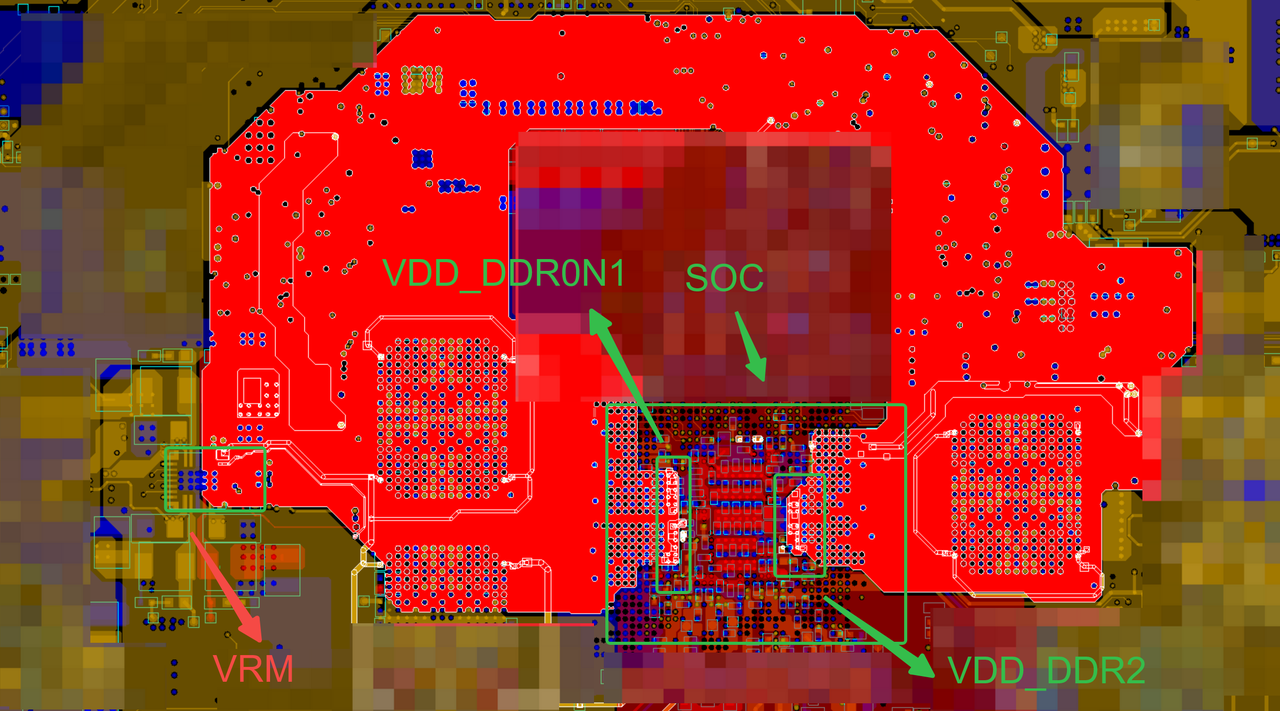 一,首先我们先去去看下芯片上的VDD_DDR0N1和VDD_DDR2这两个电源网络分布情况,其中VDD_DDR0N1主要分布在左边,VDD_DDR2这个电源网络分布在右边,我们接着看下整体电源芯片到负载芯片上的分布: