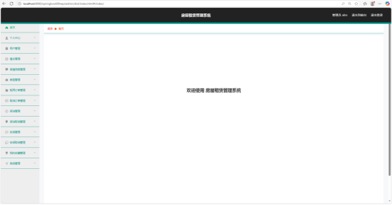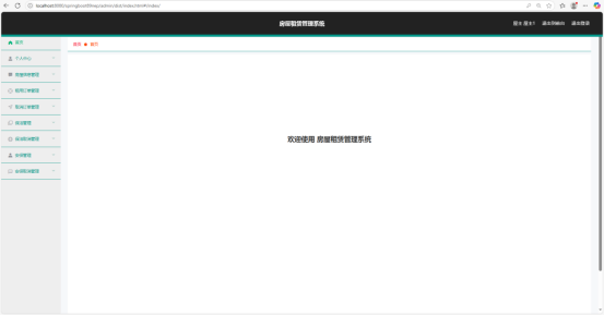 管理员后台首页是管理员进行系统管理操作的核心界面。页面左侧设置了丰富的功能导航栏,涵盖 “系统管理”“用户管理”“房屋信息管理”“租用订单管理”“保洁管理”“安保管理” 等多个功能模块。页面中间或上方可能有一些系统的统计信息或快捷操作入口,方便管理员快速了解系统运行状态并执行常用操作,高效地对系统进行全方位管理。导航栏采用折叠式设计,展开时可以清晰看到所有功能选项,折叠后节省页面空间,让页面布局更加简洁。在系统统计信息区域,会实时显示最新的用户注册数量、房源发布数量以及订单处理进度等关键数据,方便管理员掌握系统的运营动态。如图5-6所示。