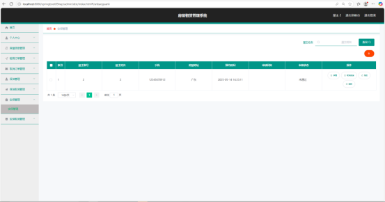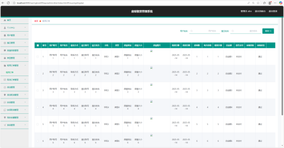 管理员租用订单管理页面以表格形式详细展示了租用订单的各类信息。表格列头包含用户姓名、屋主姓名、用户账号、联系方式、房屋地址、房屋大小、用房日期、还房日期、房间数、每天价格、租用天数、总金额、是否支付、审核状态、审核回复等字段。通过这些信息,管理员可以清晰地查看每笔订单的详细情况,对订单进行查询、审核等操作,有效管理租赁业务流程。表格支持排序功能,管理员可以根据不同的字段进行升序或降序排列,快速筛选出特定状态或时间段的订单。在审核状态和审核回复列,会根据审核结果显示不同的颜色标识,如绿色表示审核通过,红色表示审核未通过,方便管理员直观地了解订单状态。如图5-7所示。