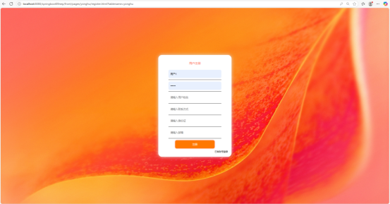用户登录和注册页面是用户进入系统的身份认证入口。登录区域设置了用户名和密码的输入框,用户需准确填写注册时的信息才能登录系统。注册区域的输入框更多,除用户名和密码外,还要求用户填写身份证号、联系方式等信息,以完善用户资料,确保注册信息的准确性和真实性,保障用户后续使用系统的安全性与便利性。登录框旁边贴心地设置了 “忘记密码” 选项,方便用户在遗忘密码时找回。注册页面中,每个输入框都有明确的提示信息,告知用户输入的格式要求,避免用户因不了解规则而反复操作。如图5-2所示。