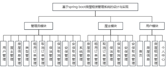 基于Spring Boot的房屋租赁管理系统的设计与实现包括三个主要功能模块:管理员模块、屋主模块和用户模块,每个模块有不同的功能,以确保系统的高效运作。