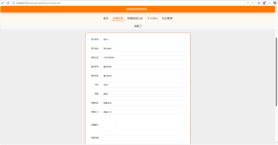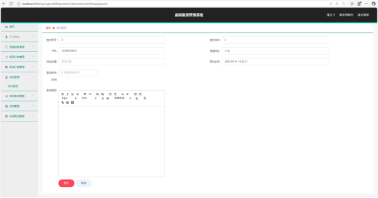 屋主房屋信息管理页面是屋主对自己房源信息进行操作的区域。页面中会展示房屋的现有信息,如房屋类型、地址、大小、房间数、价格等,同时提供编辑功能,屋主可根据实际情况对房屋信息进行修改、更新,确保房源信息的准确性和及时性,以便更好地出租房屋。在编辑功能中,对于每个可编辑的字段,都有详细的说明和示例,帮助屋主正确填写信息。修改完成后,系统会自动进行数据校验,检查信息格式是否正确、是否符合逻辑,确保修改后的信息有效。如图5-11所示。