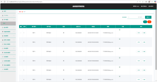 管理员用户管理页面以列表形式展示了系统中的用户信息。列表包含用户账号、用户姓名、性别、联系方式、身份证、邮箱、头像等字段,方便管理员全面了解用户的基本资料。在每行信息后还设有 “修改” 和 “删除” 按钮,管理员可根据实际管理需求,对用户信息进行修改或删除操作,实现对用户信息的有效管理和维护。当鼠标悬停在 “修改” 按钮上时,会出现提示框,显示可修改的具体信息内容,方便管理员操作。对于删除操作,系统会弹出确认提示框,避免管理员误操作删除重要用户信息,保障数据的安全性。如图5-8所示。