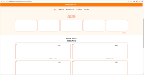 网站首页是用户进入系统后看到的初始界面,页面顶部设有导航栏,包含 “首页”“房屋信息”“房屋租赁公告”“个人中心”“后台管理” 等选项,方便用户在不同功能模块间切换。页面中有 “房屋信息推荐” 板块,展示部分推荐房源,吸引用户关注。下方还罗列了多条 “房屋租赁公告” 的标题,并附带发布时间,帮助用户快速获取重要通知。“房屋信息推荐” 板块中的房源图片清晰、简介精炼,能够快速吸引用户的注意力,激发他们进一步了解的兴趣。房屋租赁公告按发布时间倒序排列,让用户能够第一时间知晓最新的通知内容,不错过重要信息。如图5-1所示。