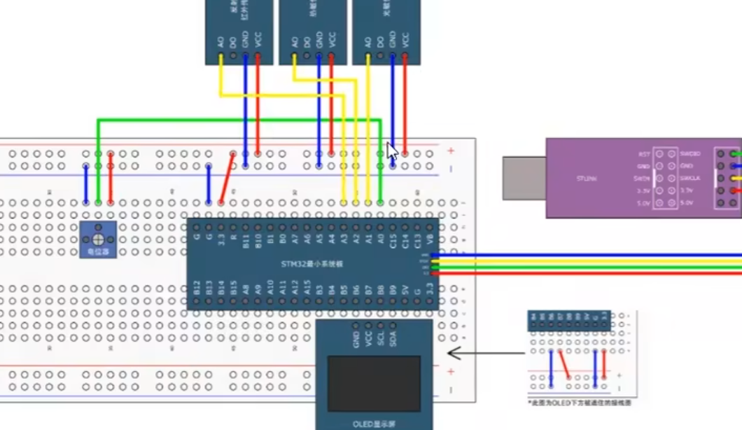 这里和上一个博客的接线图是一样的,都是PA0接一个电位器,PA1和PA3接三个传感器模块的输出。
