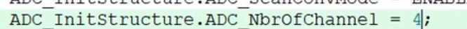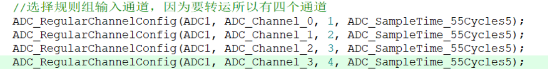 然后把规则组注入通道放在GPIO初始化下面。其中通道0放在序列1位置,通道1放在序列2位置,通道2放在序列3位置,通道3放在序列4位置。这样子序列就完成了,通道的顺序可以任意修改,这样子最终存放的数据的顺序,也会发生改变。