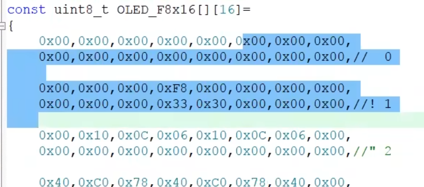 比如我们可以打开这个OLED_font.H文件,就可以看到这里面就是OLED显示英文的字库,这是一个数组,它里面的数据,决定了每个字符应该显示那些像素点。这个数组非常的长,而且是不需要更改的,所以这里就可以加一个const 把它定义在Flash里面,这样就可以,节省我们SRAM的空间。如果把const去掉了,程序不会有任何影响,只是会在SRAM里浪费这么大数组的一块空间,如果数组很大就要考虑是否消耗的起了。