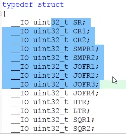 回到这里,ADC1是结构体指针,指向的是ADC1外设的起始地址。访问结构体成员,就是相当于加了一个地址偏移。起始地址+偏移就是指定的寄存器。