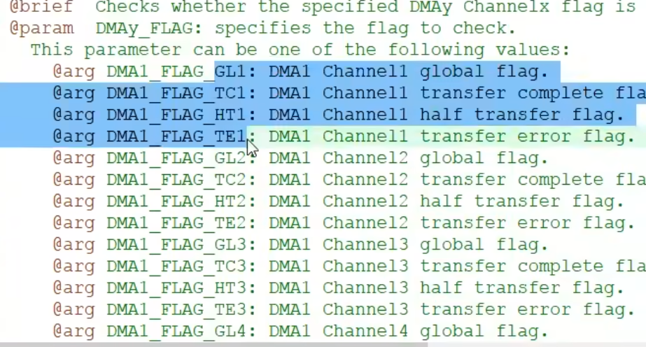 然后所有的通道都是这四种标志位。这里我们需要检查DMA1通道1转换完成的标志位。