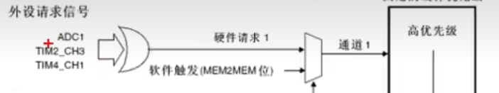 这里有三个触发源,具体选择哪个,取决于把哪个DMA的输出给开启了。