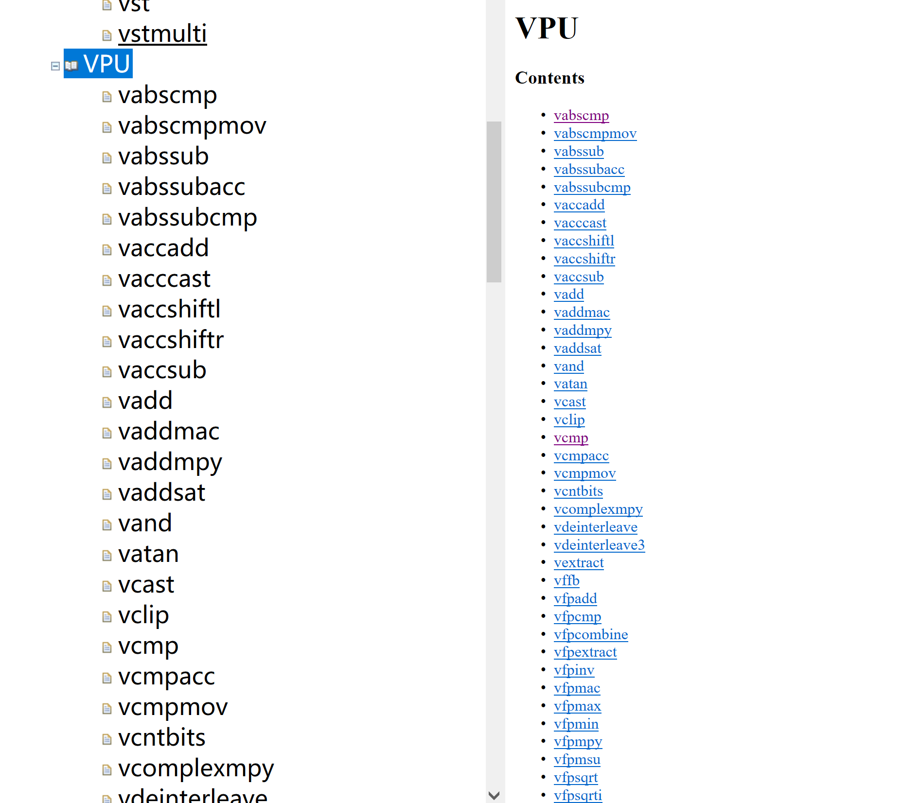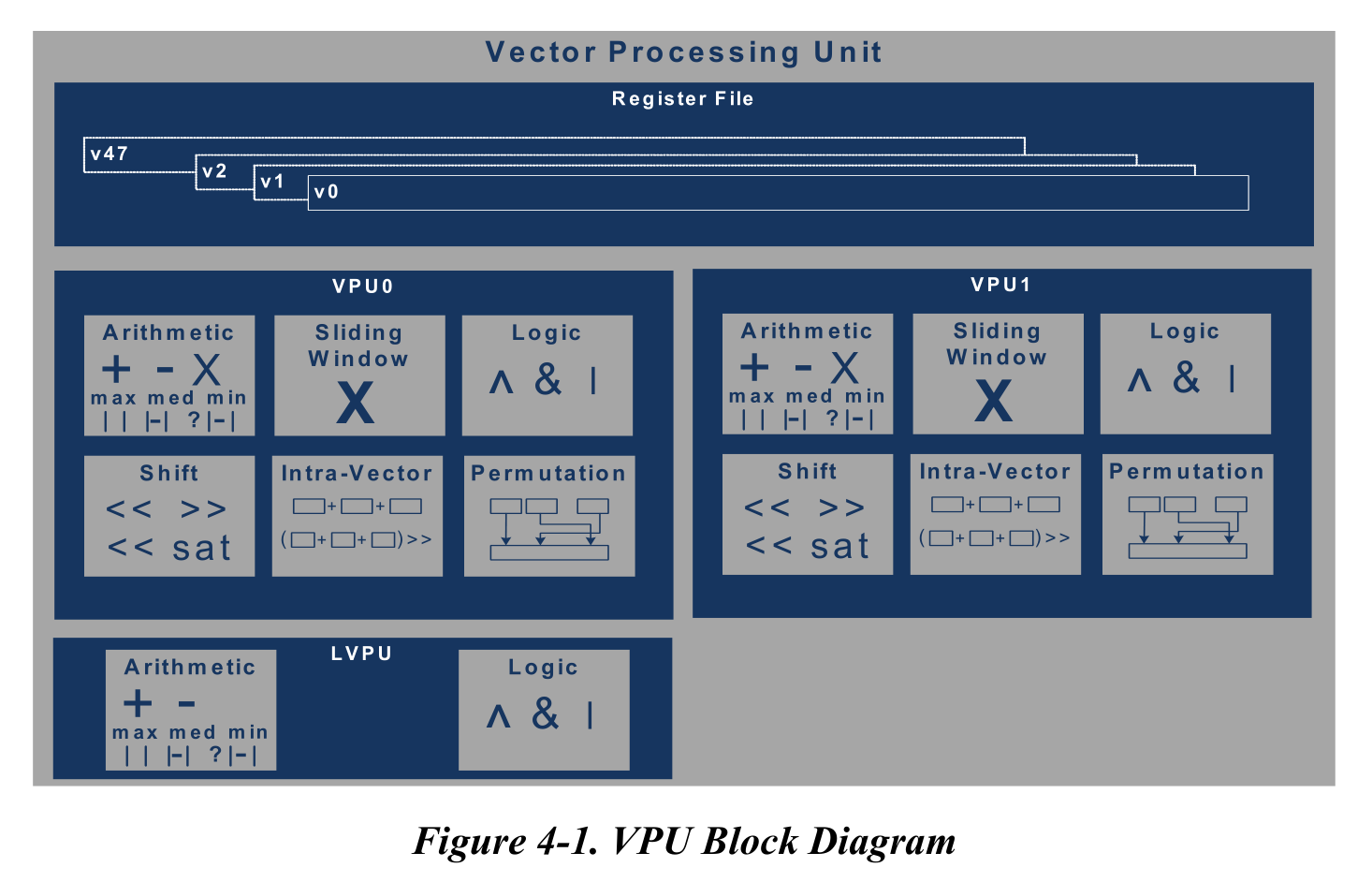 vpu支持的运算类型更加丰富,以至于文档专门用了一个框图来介绍。如下图,算数运算操作、滑窗运算操作、逻辑运算操作、移位运算操作、内部操作、置换操作等,vpu支持的指令也远多于spu模块,并行的能力上也更强。如支持vector mac fixed point 128(16x8),128(16x16),16(32x32) 运算,vector mac floating point 16(32bit) or 32(16bit) 运算。