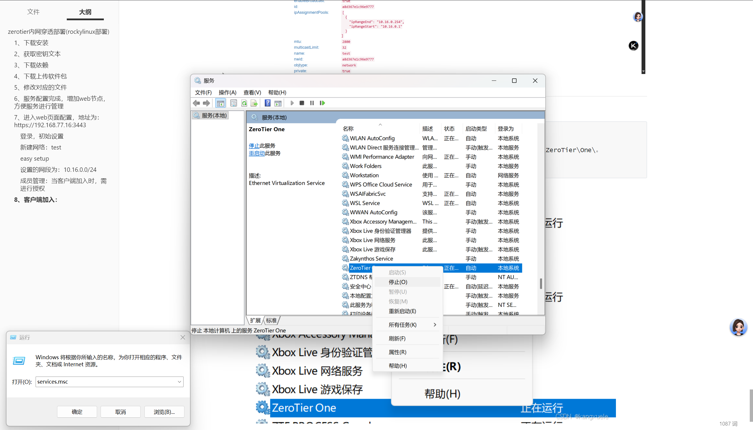安装官方客户端自动安装后在右下角有ZeroTierUI, 先退出将服务端的Planet下载下来用服务端的 planet替换本地的planet默认planet路径 C:\ProgramData\ZeroTier\One\。##建议将原来的planet做备份,文件名为planet.bak重启ZeroTier服务 ##快速打开:win + r 输入services.msc重新启动ZeroTier应用程序,等待服务状态变为运行中。连接私有网络