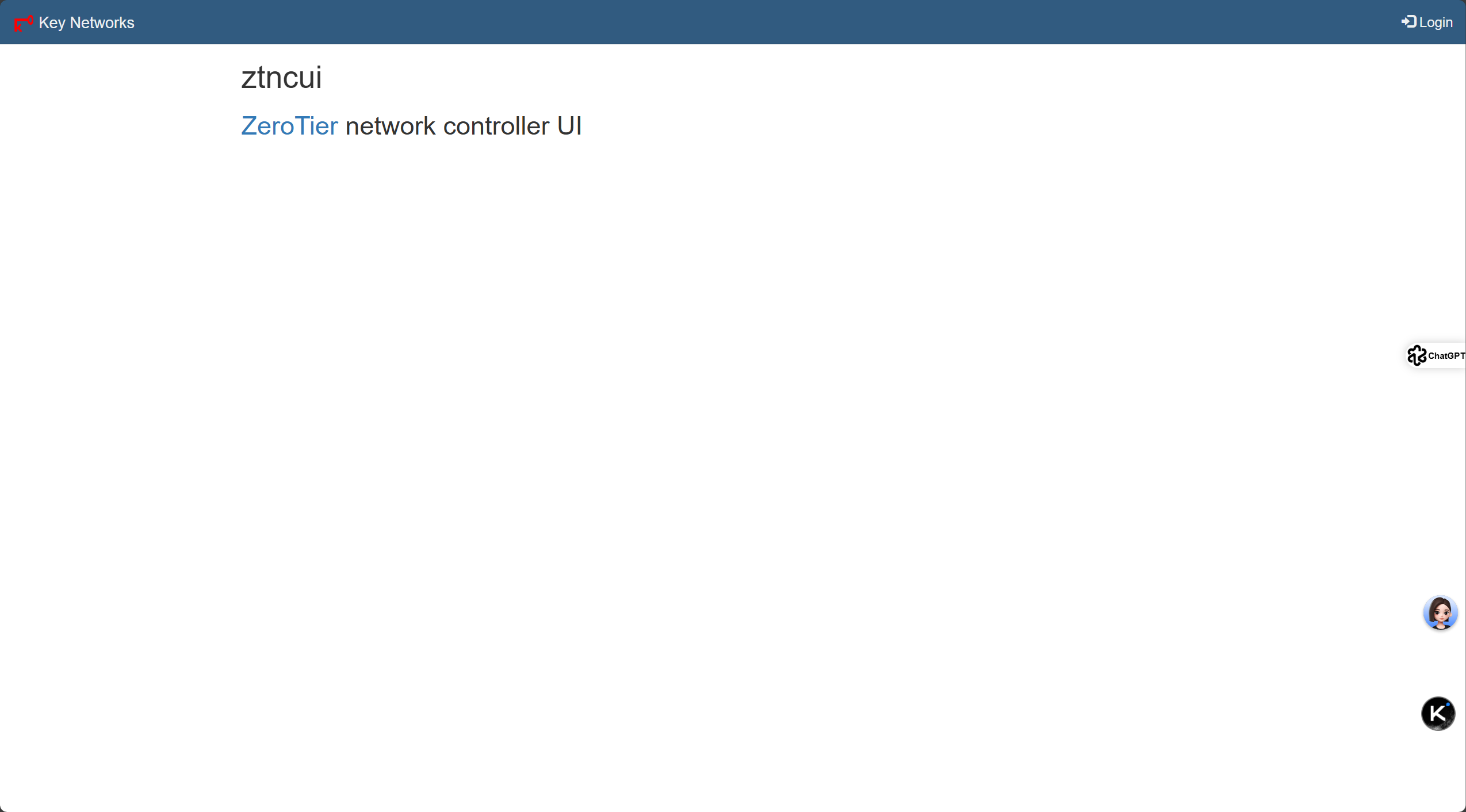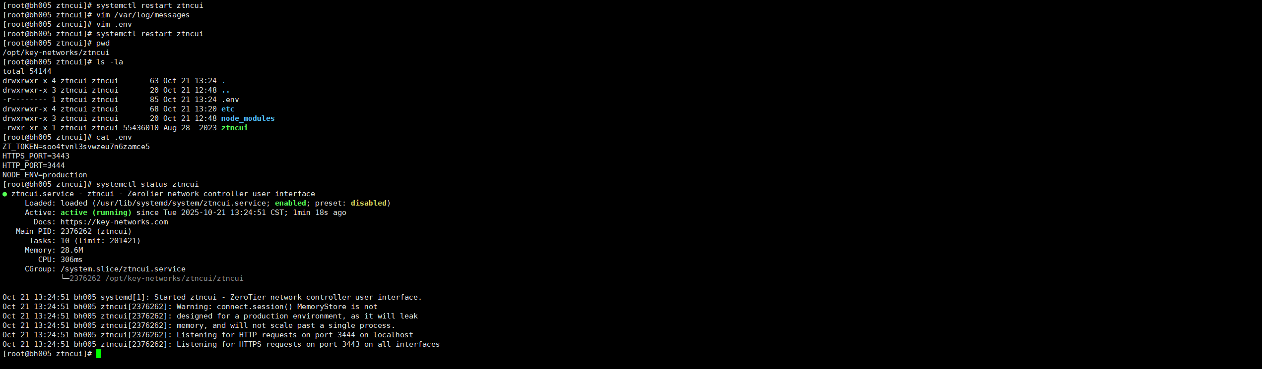 PS:ubuntu下载方式: curl -O https://s3-us-west-1.amazonaws.com/key-networks/deb/ztncui/1/x86_64/ztncui_0.8.14_amd64.deb apt install ./ztncui_0.8.14_amd64.deb sh -c "echo ZT_TOKEN=`sudo cat /var/lib/zerotier-one/authtoken.secret` > /opt/key-networks/ztncui/.env" sh -c "echo HTTPS_PORT=3443 >> /opt/key-networks/ztncui/.env" sh -c "echo NODE_ENV=production >> /opt/key-networks/ztncui/.env" chmod 400 /opt/key-networks/ztncui/.env chown ztncui.ztncui /opt/key-networks/ztncui/.env systemctl restart ztncui