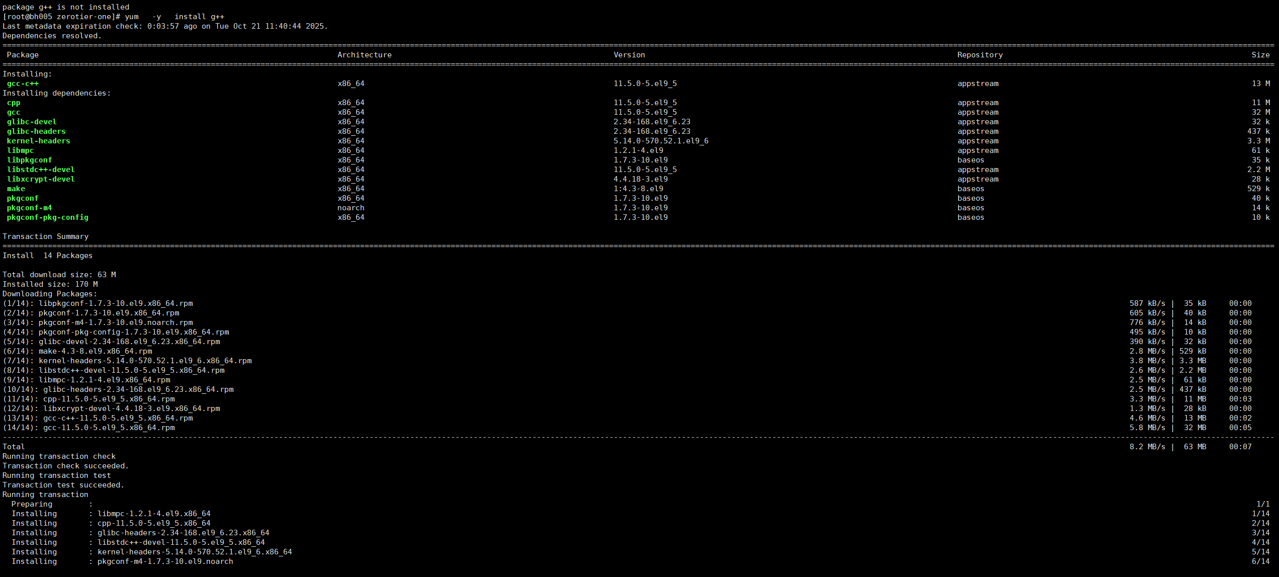 #如果缺少软件包,在这个命令执行后会提示缺少哪些软件包,自行安装即可yum -y install g++