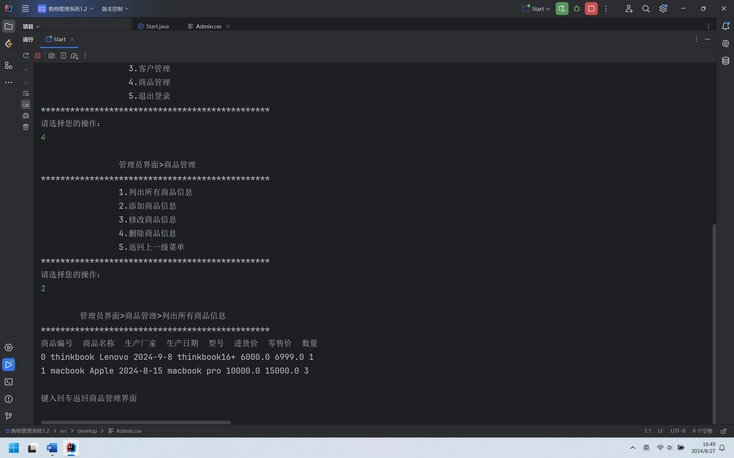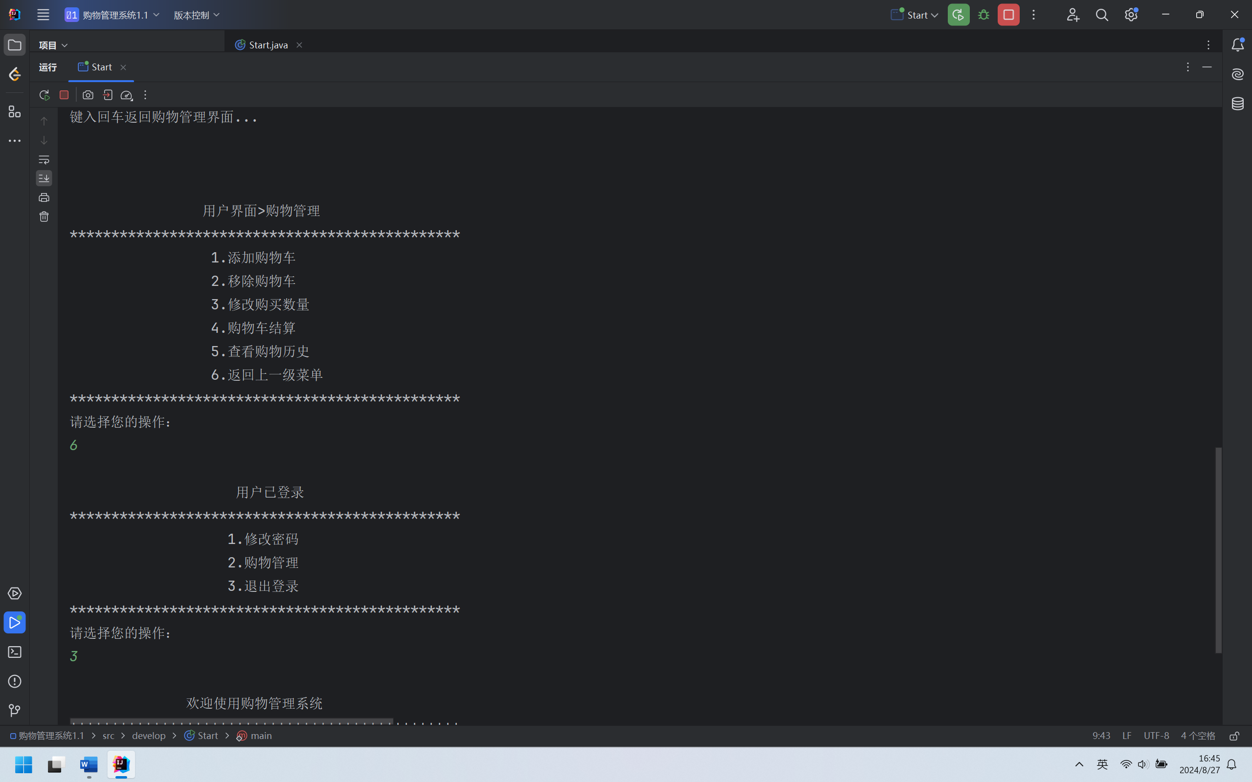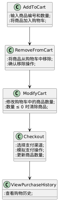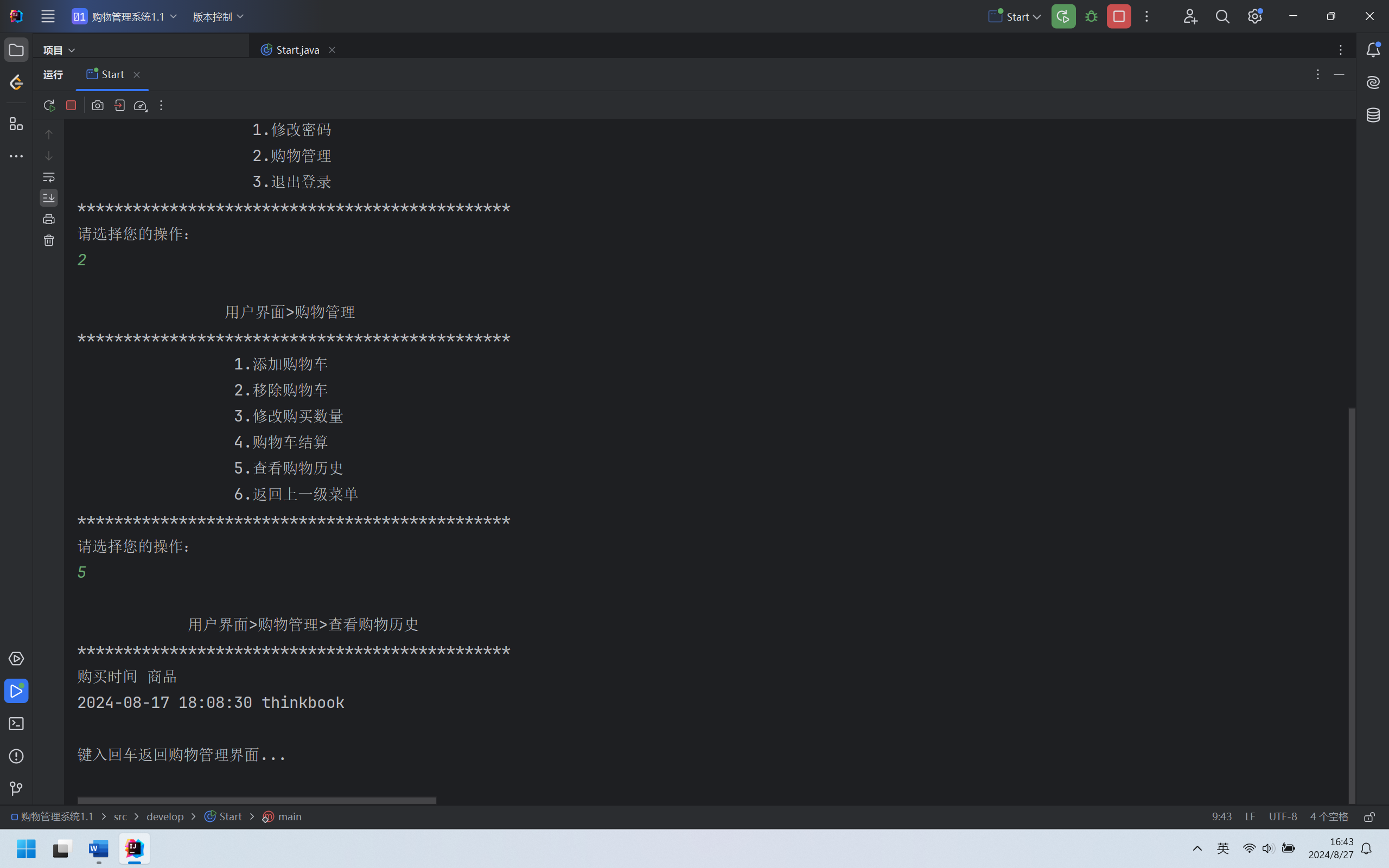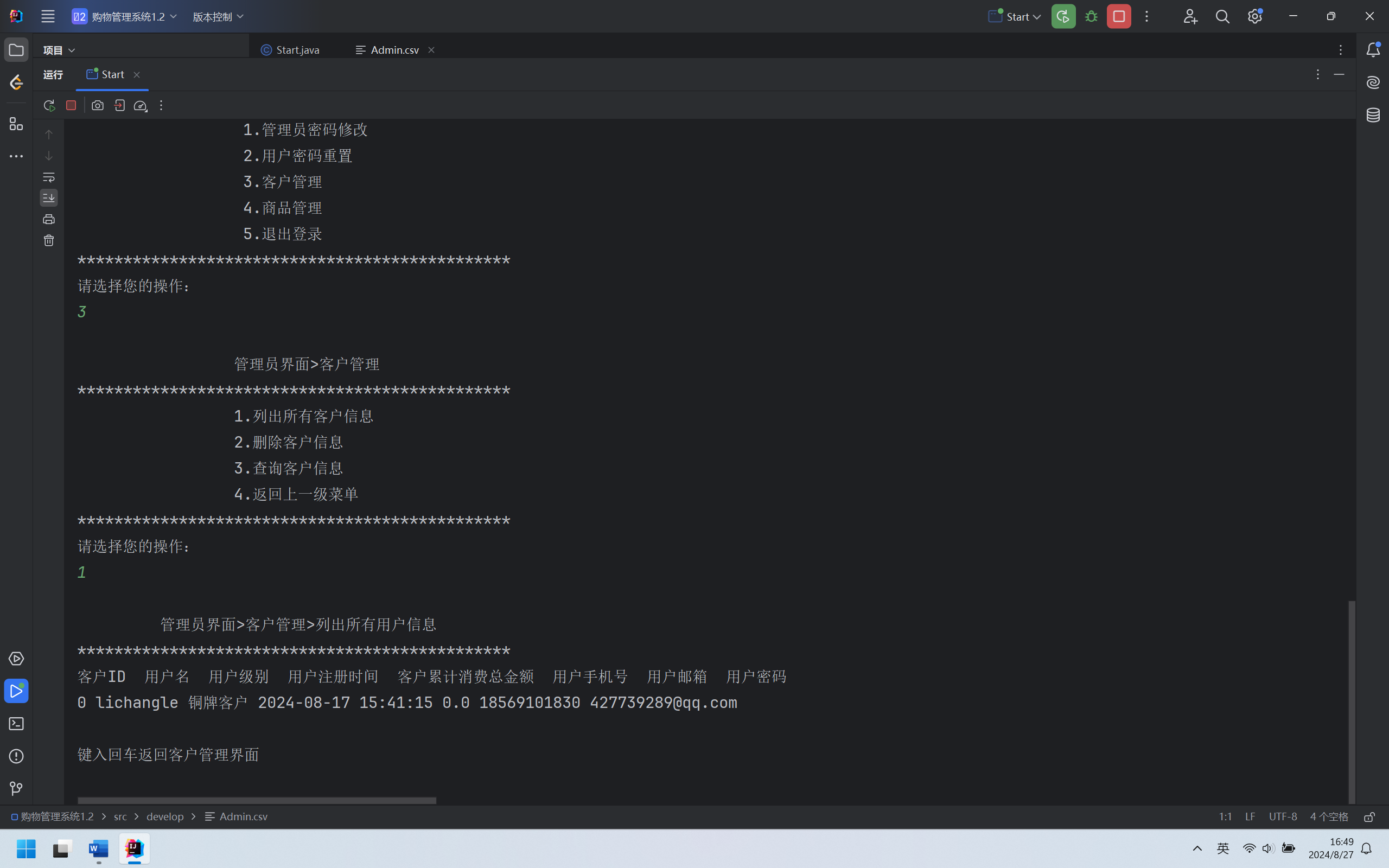 1.1版:使用集合框架类ArrayList存放用户信息、商品信息和购物历史信息,该版本支持将用户信息、商品信息、购物历史信息存放到文本文件txt中。