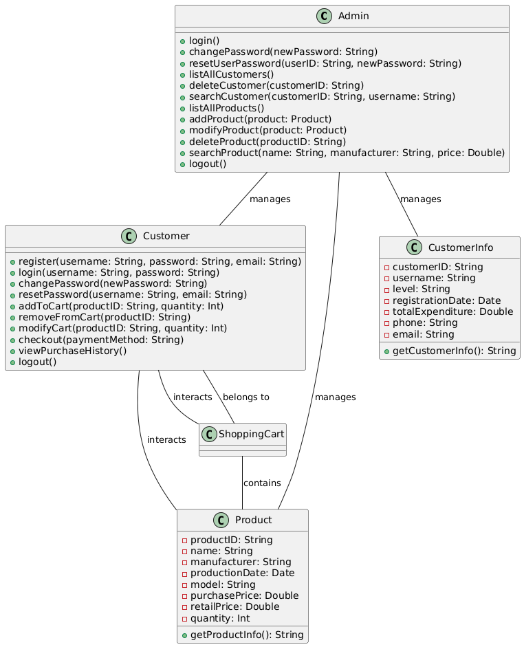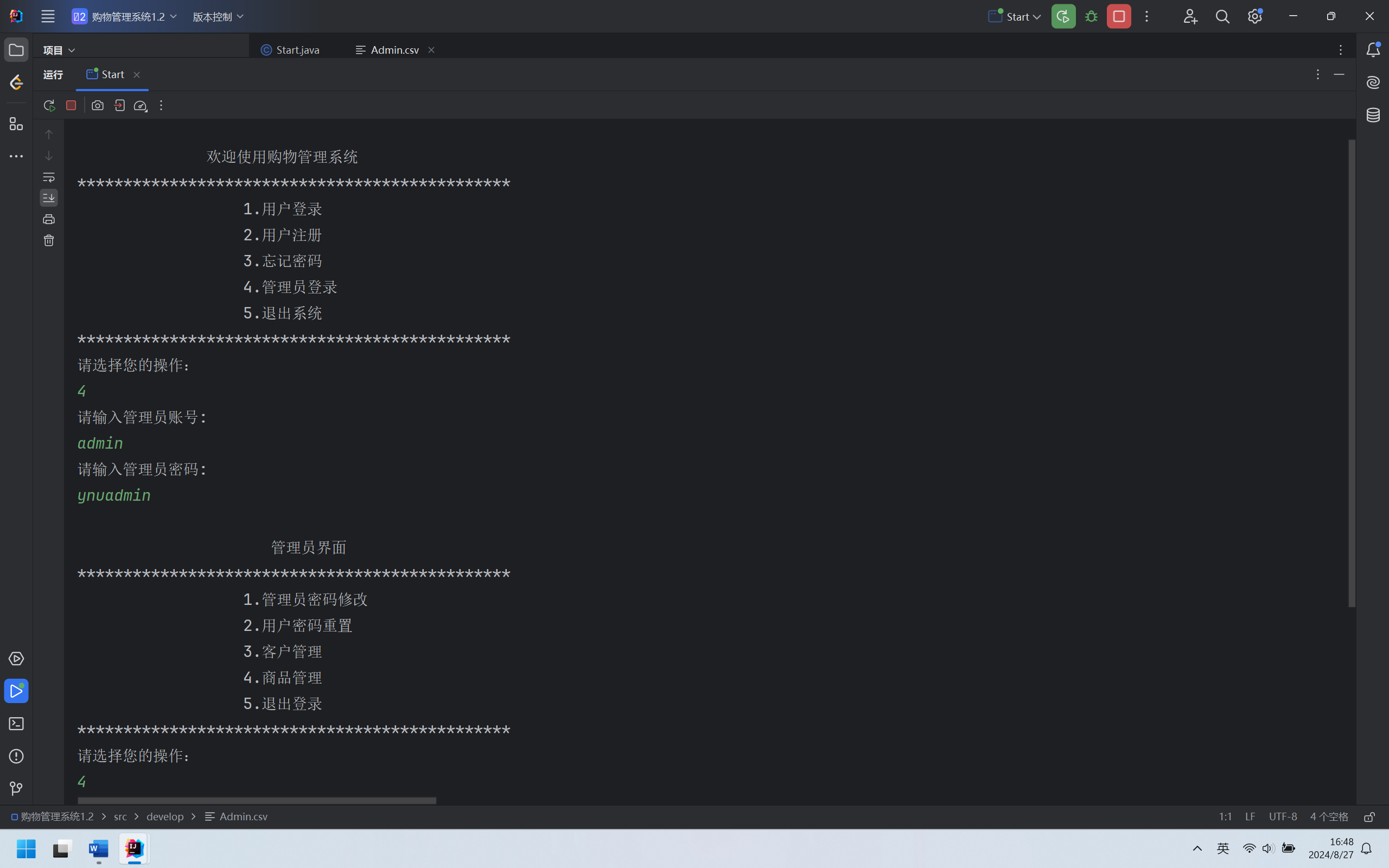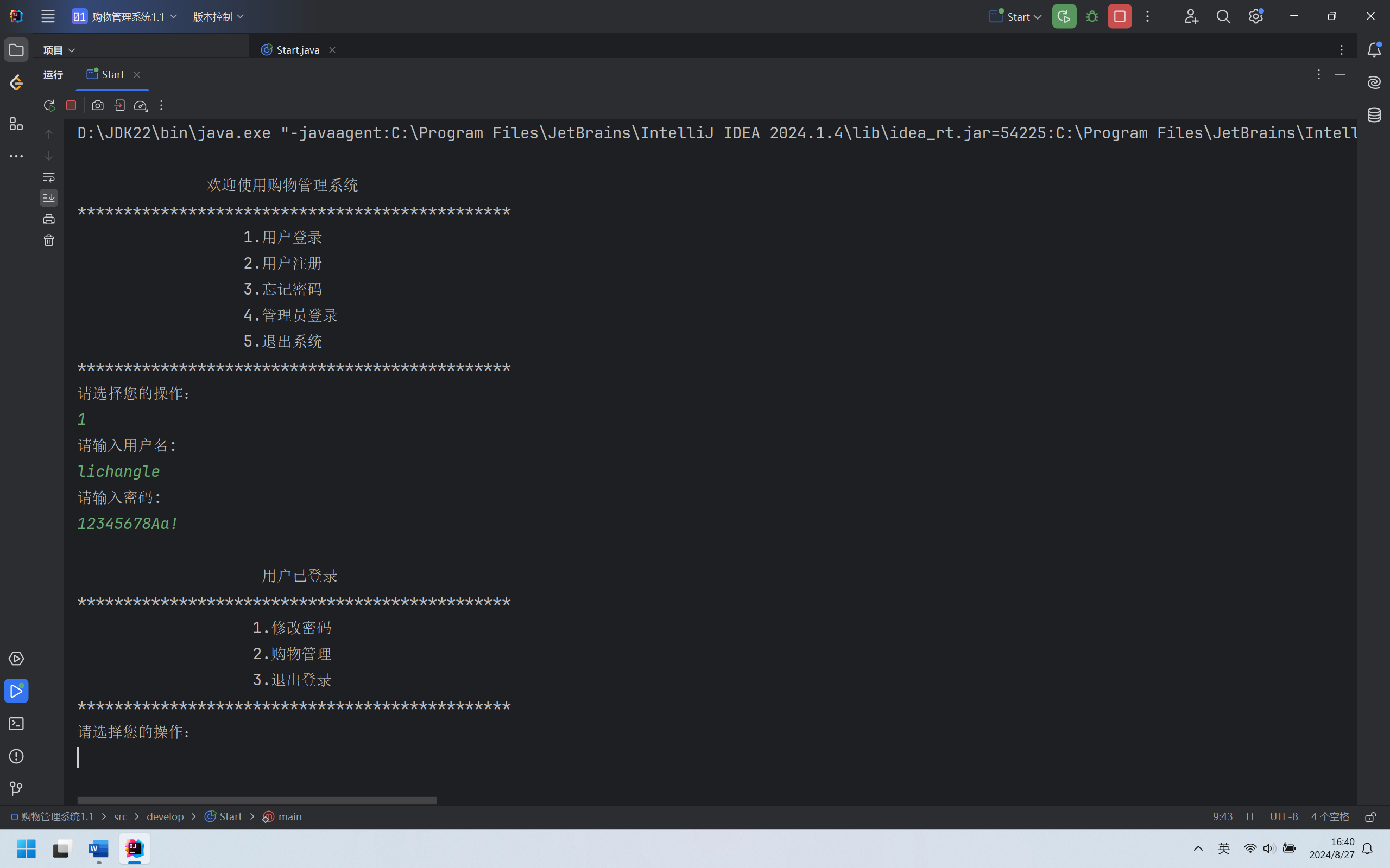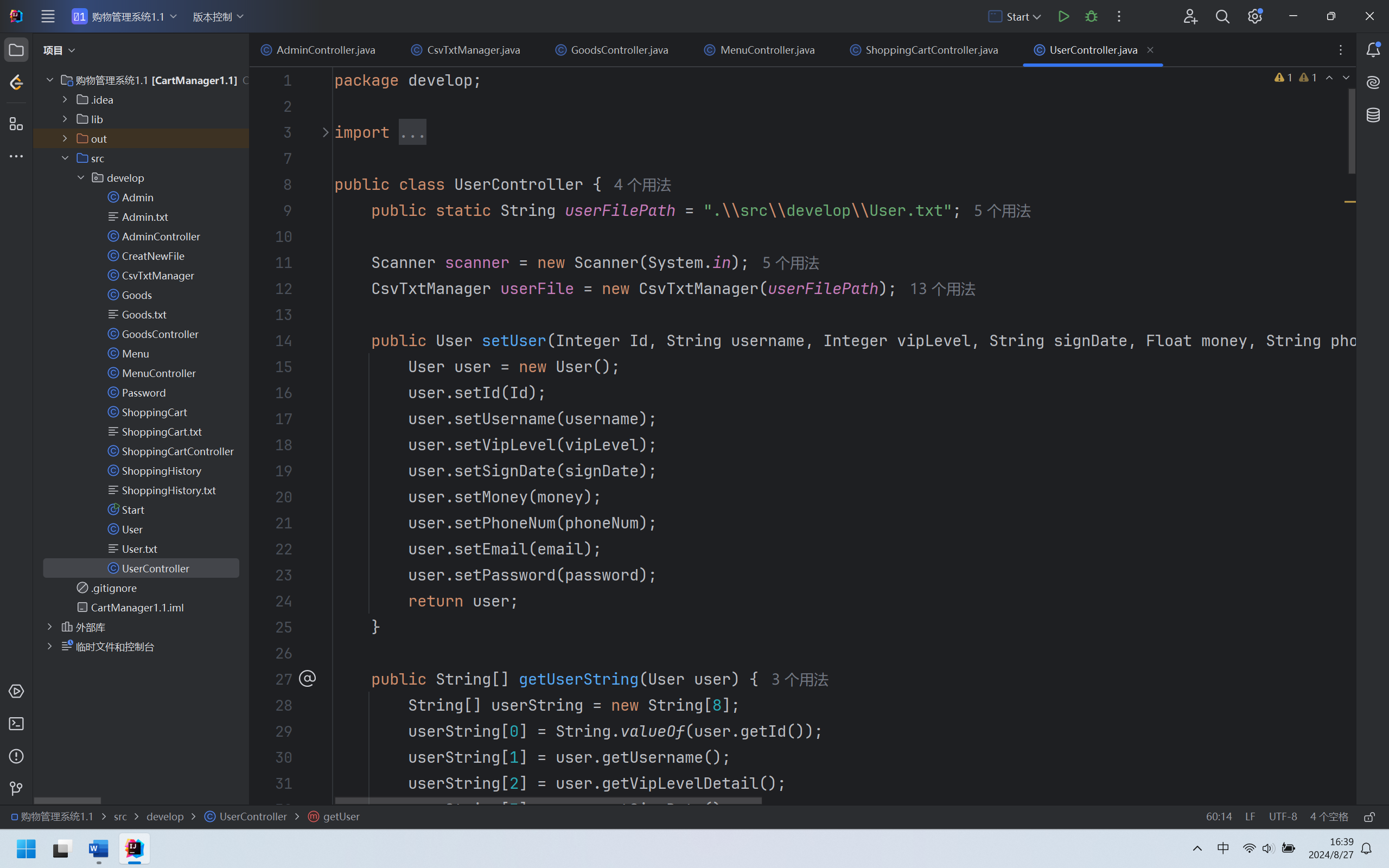 1.1版:使用集合框架类ArrayList存放用户信息、商品信息和购物历史信息,该版本支持将用户信息、商品信息、购物历史信息存放到文本文件txt中。