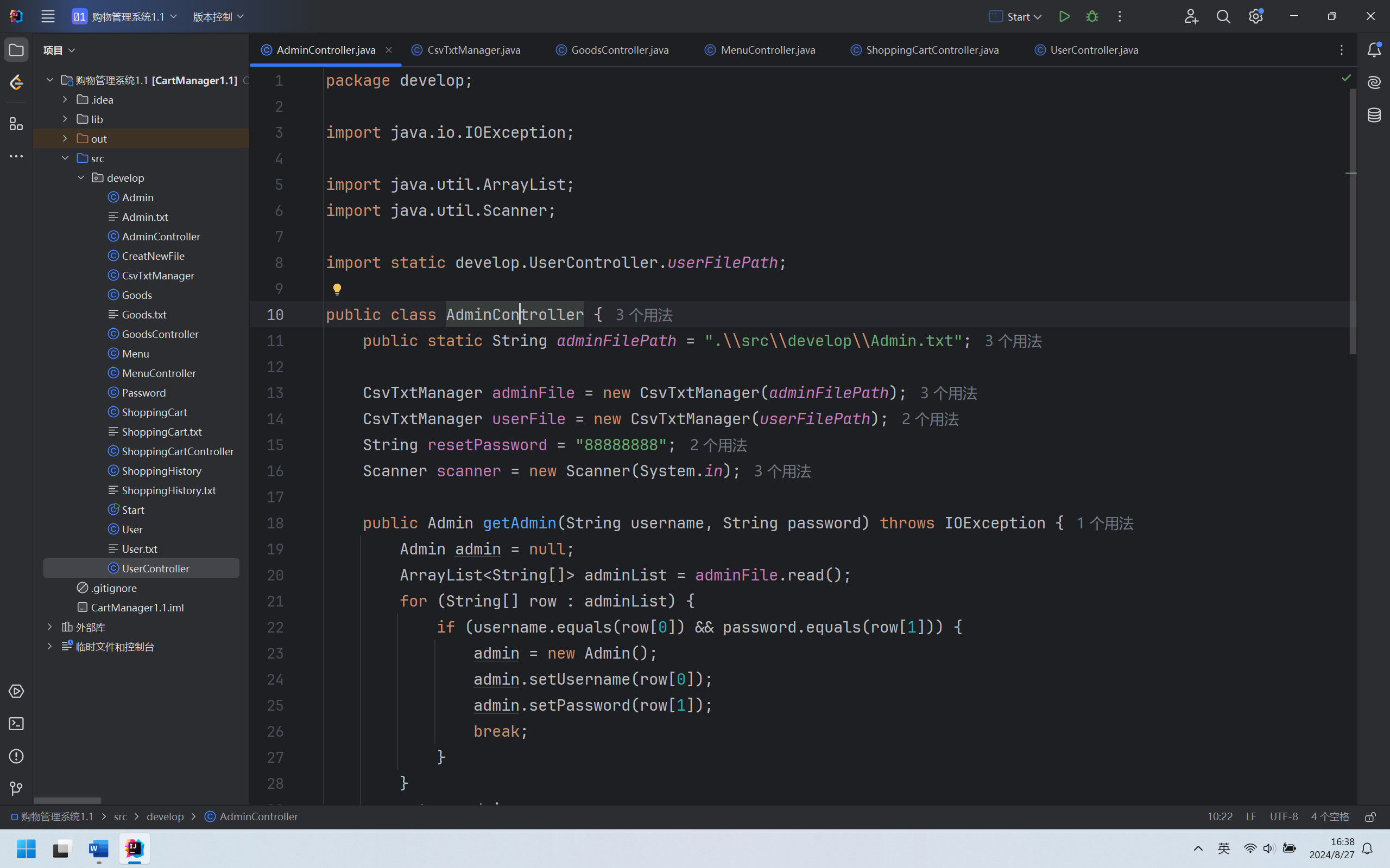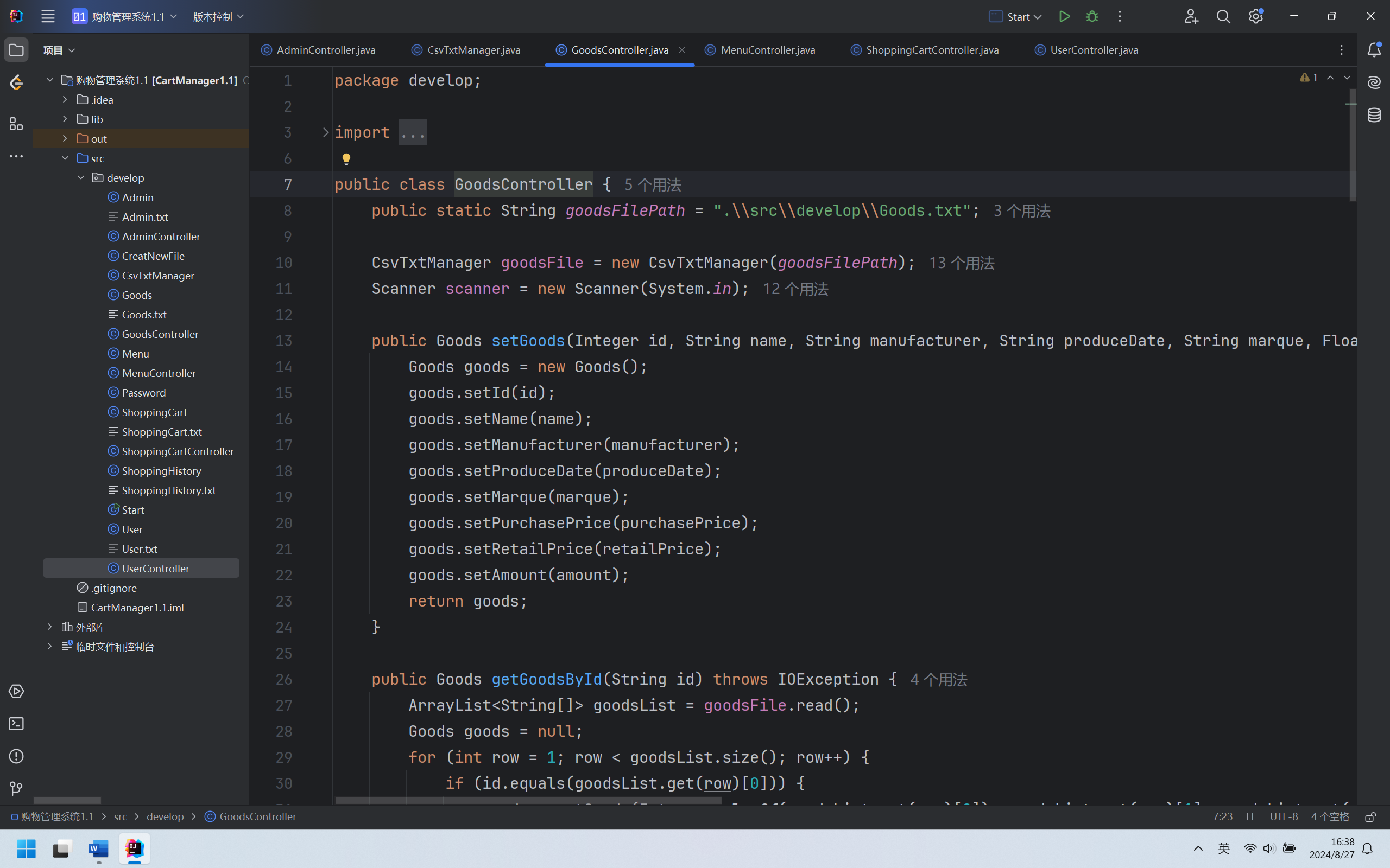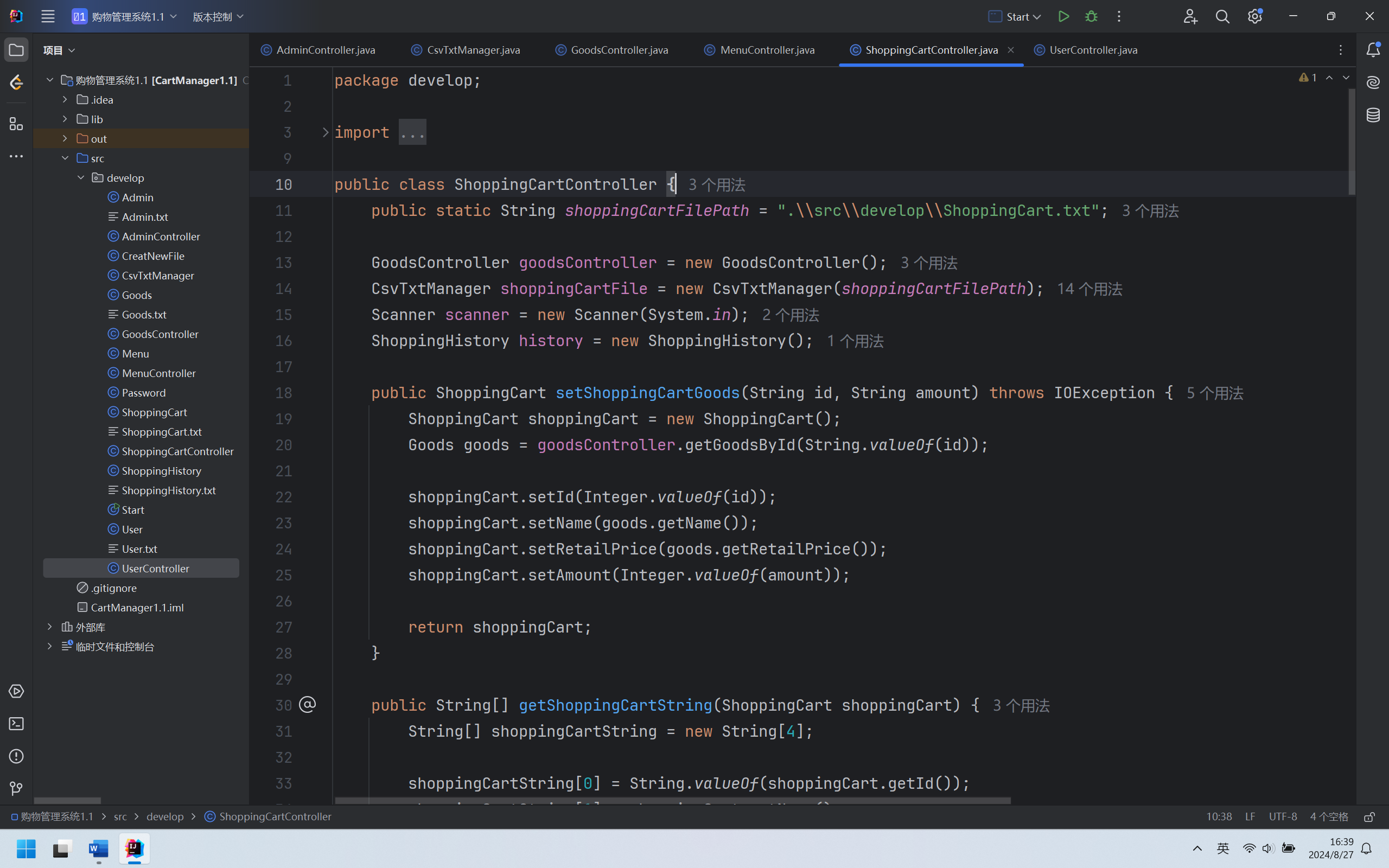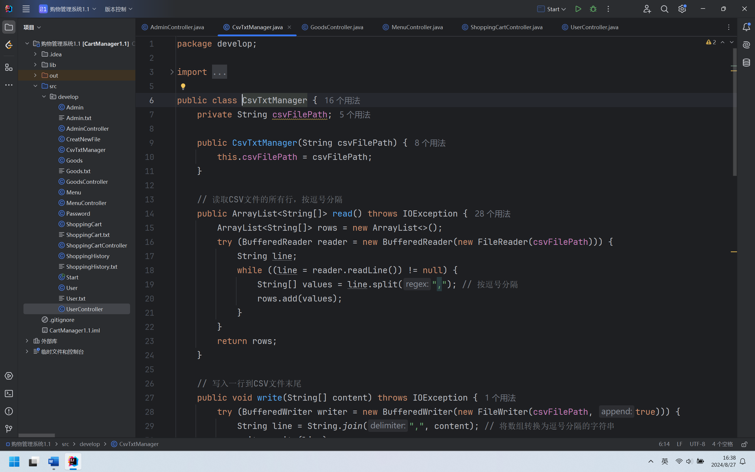 1.1版:使用集合框架类ArrayList存放用户信息、商品信息和购物历史信息,该版本支持将用户信息、商品信息、购物历史信息存放到文本文件txt中。