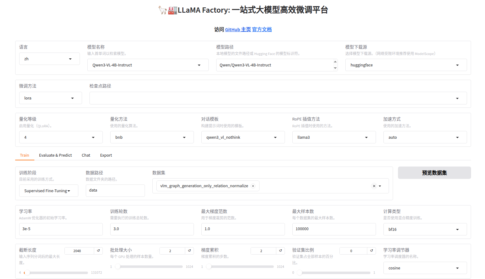 - 首先使用LLaMA Factory,对Qwen3-VL-4b进行Lora监督微调,得到微调后的lora权重;