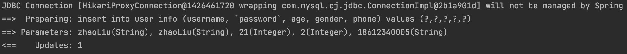 @Insert("insert into user_info (username, `password`, age, gender, phone) values (#{username},#{password},#{age},#{gender},#{phone})")