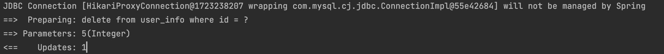 @Testvoid delete() {userInfoMapper.delete(1);}
