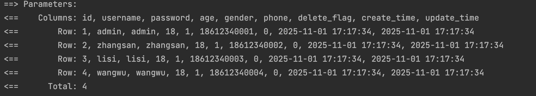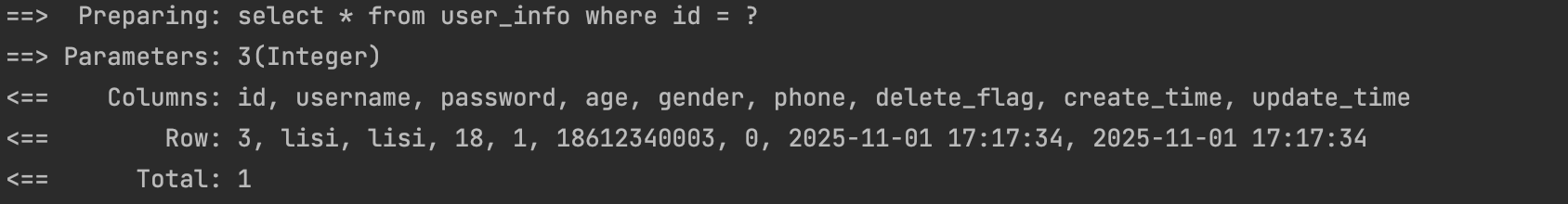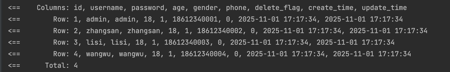 @Select("select id, username, `password`, age, gender, phone, delete_flag, create_time, update_time from user_info")