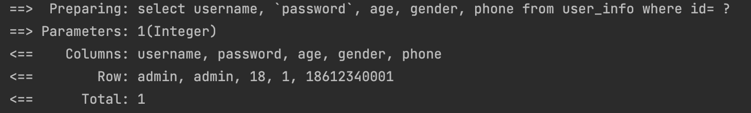 select username, `password`, age, gender, phone from user_info where id= ?//使用${}
