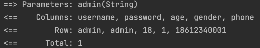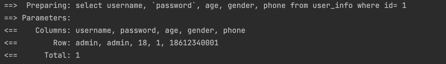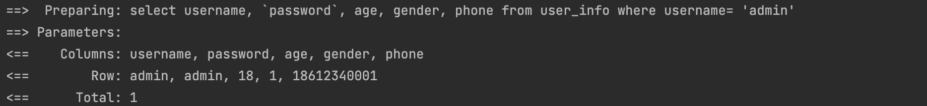 @Select("select username, `password`, age, gender, phone from user_info where username= '${name}' ")UserInfo queryByName2(String name);