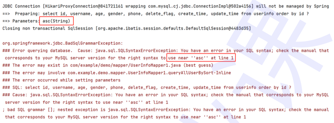 可以发现,当使用 #{sort} 查询时,asc 前后自动给加了引号,导致 sql 错误。