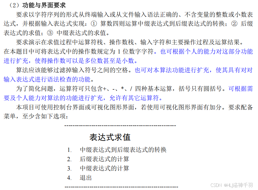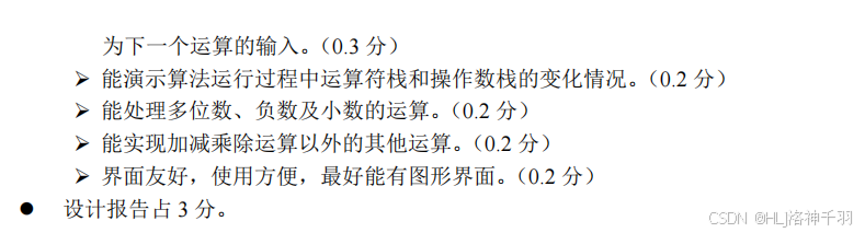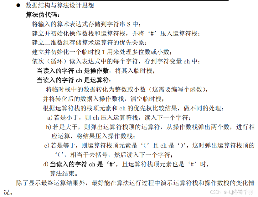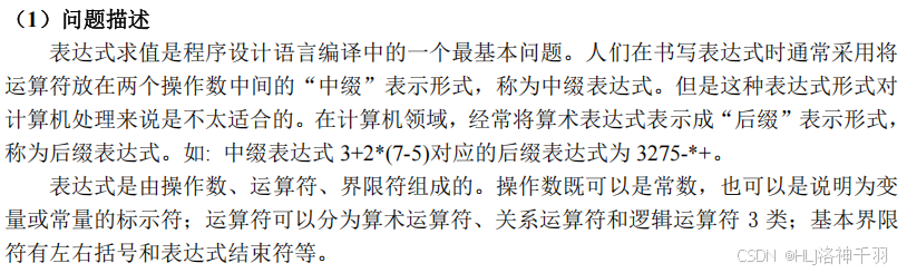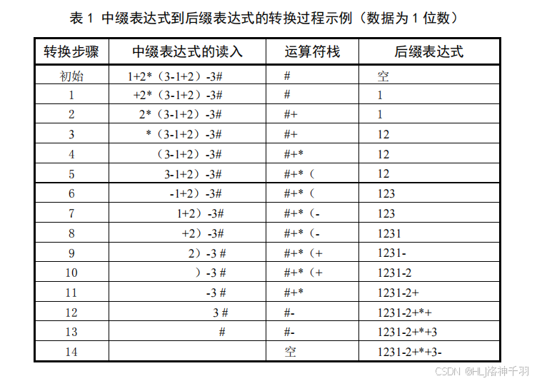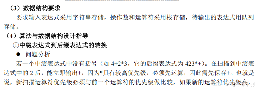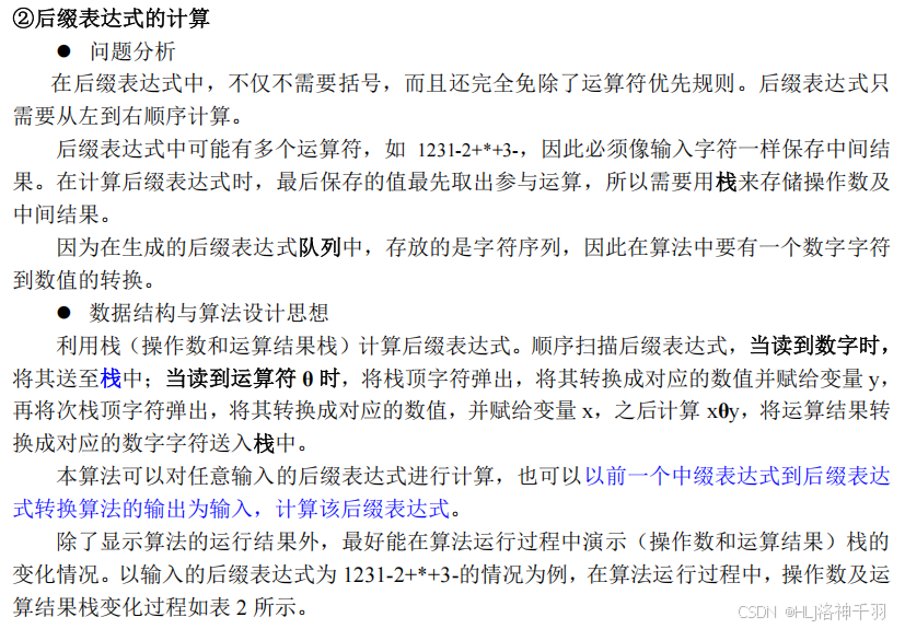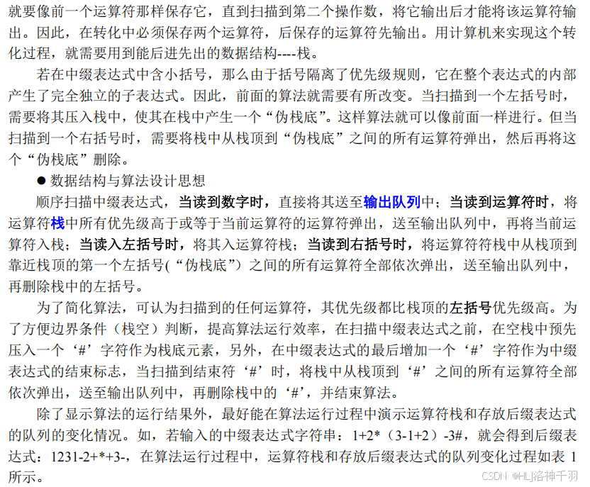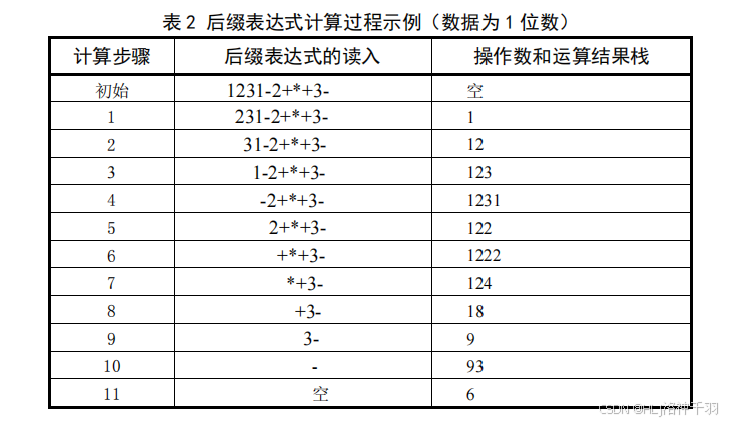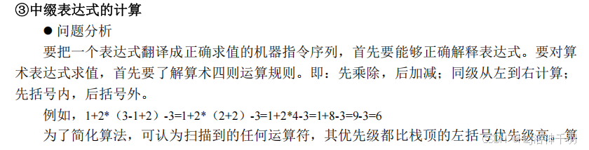 import java.util.Stack;public class SuffixExpression {/*** @description: 先将中缀表达式转 换成list集合* @param: [s]* @return: java.util.List<java.lang.String>*/public static List<String> zhongZhuiList(String s) {List<String> list = new ArrayList<>();String str;//用于拼接多位数char c;//每遍历到一个字符,就放入到cint i = 0;//指针,用于遍历中缀表达式do {//先判断是不是运算符if ((c = s.charAt(i)) < 48 || (c = s.charAt(i)) > 57) {//ASCII码48~57为0到9十个阿拉伯数字list.add(c + "");i++;} else {//是数字,需要考虑多位数str = "";while (i < s.length() && (c = s.charAt(i)) >= 48 && (c = s.charAt(i)) <= 57) {str = str + c;i++;}list.add(str);}} while (i < s.length());return list;}/*** @description: 将得到的中缀表达式对应的list转换成后缀表达式对应的list* @param: [list]* @return: java.util.List<java.lang.String>*/public static List<String> houZhuiList(List<String> list) {Stack<String> s1 = new Stack<>();List<String> s2 = new ArrayList<>();//遍历中缀表达式集合for (String item : list) {//如果是一个数字,加入到s2if (item.matches("\\d+")) {//matches() 方法用于检测字符串是否匹配给定的正则表达式s2.add(item);} else if (item.equals("(")) {s1.push(item);} else if (item.equals(")")) {//如果是右括号,则依次弹出s1栈顶的运算符,并压入s2,直到遇到左括号为止,此时将这对括号丢弃while (!s1.peek().equals("(")) {s2.add(s1.pop());}s1.pop();//将(弹出s1} else {//当item的优先级小于等于s1栈顶运算符的优先级时,将s1栈顶的运算符弹出并压入到s2while (s1.size() != 0 && Operation.get(s1.peek()) >= Operation.get(item)) {s2.add(s1.pop());}s1.push(item);//还需要将item压入栈}}while (s1.size() != 0) {//将s1中剩余的运算符依次弹出并加入s2s2.add(s1.pop());}return s2;}/*** @description: 计算中缀表达式* @param: [list]* @return: java.util.List<java.lang.String>*/public static List<String> calzhongZhui(List<String> list) {Stack<String> s1 = new Stack<>();Stack<String> num = new Stack<>();List<String> s2 = new ArrayList<>();for (String item : list) {if (item.matches("\\d+")) {num.push(item);} else if (item.equals("(")) {s1.push(item);} else if (item.equals(")")) {while (!s1.peek().equals("(")) {cal2(s1, num);s1.pop();}s1.pop();} else {while (s1.size() != 0 && Operation.get(s1.peek()) >= Operation.get(item)) {cal2(s1, num);s1.pop();}s1.push(item);}}while (s1.size() != 0) {cal2(s1, num);s1.pop();}s2.add(num.pop());return s2;}public static Stack<String> cal2(Stack<String> s1, Stack<String> s2) {int num2 = Integer.parseInt(s2.pop());int num1 = Integer.parseInt(s2.pop());int res = 0;if (s1.peek().equals("+")) {res = num1 + num2;} else if (s1.peek().equals("-")) {res = num1 - num2;} else if (s1.peek().equals("*")) {res = num1 * num2;} else if (s1.peek().equals("/")) {res = num1 / num2;} else {throw new RuntimeException("运算符有错误");}//把计算结果入栈s2.push(res + "");return s2;}/*** @description: 完成对后缀表达式的运算* @param: [list]* @return: int*/public static int cal(List<String> list) {Stack<String> stack = new Stack<>();//遍历listfor (String p : list) {//使用正则表达式来取数if (p.matches("\\d+")) {//匹配的是多位数stack.push(p);//如果是数字,则入栈,如果是符号则进行运算} else {int num2 = Integer.parseInt(stack.pop());int num1 = Integer.parseInt(stack.pop());int res = 0;if (p.equals("+")) {res = num1 + num2;} else if (p.equals("-")) {res = num1 - num2;} else if (p.equals("*")) {res = num1 * num2;} else if (p.equals("/")) {res = num1 / num2;} else {throw new RuntimeException("运算符有错误");}//把计算结果入栈stack.push(res + "");}}return Integer.parseInt(stack.pop());}public static void main(String[] args) {String s = "1+((2+3)*4)-5";System.out.println(s);System.out.println("中缀表达式转成后缀表达式:");List<String> list = houZhuiList(zhongZhuiList(s));for (String str : list) {System.out.print(str + " ");}System.out.println();System.out.println("计算后缀表达式:");System.out.println(cal(houZhuiList(zhongZhuiList(s))));System.out.println("计算中缀表达式:");List<String> strings = calzhongZhui(zhongZhuiList(s));for (String string : strings) {System.out.println(string);}}