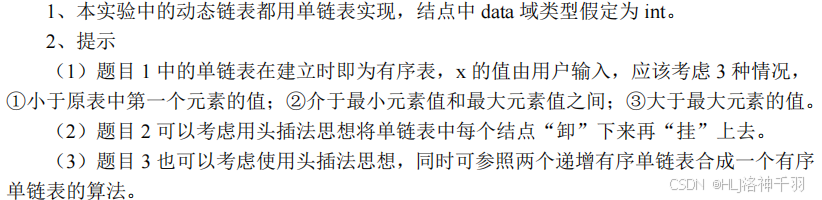 package 实验二;import java.util.Scanner;public class LinkList {private Node head;private int num;//初始化(建立)空链表public LinkList() {num = 0;head = null;}public LinkList(Node head) {this.head = head;}//初始化(建立)一个具有n个结点的链表public LinkList(int n) {num = n;head = new Node();Node p = head;for (int i = 1; i < n; i++) {p.setNext(new Node());p = p.getNext();}}/*** @description: 插入* @date: 2023/10/28 20:00* @param: [x]* @return: void**/public void insert(int x) {Node temp = new Node(x);num++;if (head == null) {head = temp;} else {if (x < head.getData()) {temp.setNext(head);head = temp;} else {Node p = head;while (p.getNext() != null && p.getNext().getData() < x) {p = p.getNext();}temp.setNext(p.getNext());p.setNext(temp);}}}/*** @description: 输出链表中所有结点data域的值* @date: 2023/10/28 20:01* @param: []* @return: void**/public void linkPrint() {Node p = head;if (head != null) {while (p.getNext() != null) {System.out.print(p.getData() + " ");p = p.getNext();}System.out.print(p.getData() + " ");} else {System.out.println("链表中没有数据!!!");}}/*** @description: 选择排序(升序)* @date: 2023/10/28 20:01* @param: [head]* @return: void**/public void sortList(Node head) {Node p = head;int temp = 0;while (p != null) {Node next = p.getNext();while (next != null) {if (next.getData() < p.getData()) {temp = p.getData();p.setData(next.getData());next.setData(temp);}next = next.getNext();}p = p.getNext();}}/*** @description: 选择排序(降序)* @date: 2023/10/28 20:01* @param: [head]* @return: void**/public void sortList_2(Node head) {Node q = head;int temp = 0;while (q != null) {Node next = q.getNext();while (next != null) {if (next.getData() > q.getData()) {temp = q.getData();q.setData(next.getData());next.setData(temp);}next = next.getNext();}q = q.getNext();}}/*** @description: 逆置 从原来的链表把第一个节点一个一个逮出来,然后头插到新链表中* @date: 2023/10/28 20:01* @param: [head]* @return: void**/public void reverse(Node head) {Node p = head; //head原链表头结点Node temp = null;//暂时保存的原来的头结点Node result = null;//新链表头结点while (p != null) {temp = p;p = p.getNext();temp.setNext(result);result = temp;}if (head != null) {while (result.getNext() != null) {System.out.print(result.getData() + " ");result = result.getNext();}System.out.print(result.getData() + " ");} else {System.out.println("链表中没有数据!!!");}}/*** @description: 连接* @date: 2023/10/28 20:02* @param: [p]* @return: void**/public void connect(LinkList p) {Node p1 = head;num = p.num + num;while (p1.getNext() != null) {p1 = p1.getNext();}Node p2 = p.head;while (p2 != null) {p1.setNext(new Node(p2.getData()));p1 = p1.getNext();p2 = p2.getNext();}}public static void main(String[] args) {Scanner sc = new Scanner(System.in);//插入测试System.out.println("请输入链表1的初始长度: ");int n1 = sc.nextInt();System.out.println("请往链表1中输入数据: ");LinkList l1 = new LinkList(n1);System.out.println("显示链表1: ");l1.linkPrint();System.out.println();System.out.println("请输入插入的数据:");int x = sc.nextInt();l1.insert(x);l1.sortList(l1.head);System.out.println("显示插入之后的链表:");l1.linkPrint();//逆置测试System.out.println();System.out.println("请输入链表2的初始长度: ");int n2 = sc.nextInt();System.out.println("请往链表2中输入数据: ");LinkList l2 = new LinkList(n2);System.out.println("显示链表2: ");l2.sortList(l2.head);l2.linkPrint();System.out.println();System.out.println("逆置后链表为:");l2.reverse(l2.head);//归并降序测试System.out.println();System.out.println("请输入链表3的初始长度: ");int n3 = sc.nextInt();System.out.println("请往链表3中输入数据: ");LinkList l3 = new LinkList(n3);System.out.println("显示链表3: ");l3.linkPrint();System.out.println();System.out.println("请输入链表4的初始长度: ");int n4 = sc.nextInt();System.out.println("请往链表4中输入数据: ");LinkList l4 = new LinkList(n4);System.out.println("显示链表4: ");l4.linkPrint();System.out.println();System.out.println("连接链表3和链表4: ");l3.connect(l4);l3.linkPrint();System.out.println();System.out.println("将连接好的链表降序输出: ");l3.sortList_2(l3.head);l3.linkPrint();}