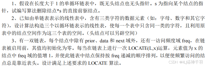 package 实验三.题目三;public class LinkList {private Node head;public LinkList() {}public LinkList(Node head) {this.head = head;}public Node getHead() {return head;}public void setHead(Node head) {this.head = head;}public Node get(int index) {if (head != null) {int count = 0;Node temp = head;while (temp.getNext() != null) {if (count == index) {return temp;}count++;temp = temp.getNext();}if (count == index) {return temp;}}return null;}public void add(Object data) {Node node = new Node(data);if (head == null) {head = node;} else {Node temp = head;while (temp.getNext() != null) {temp = temp.getNext();}temp.setNext(node);}}public int size() {if (head == null) {return 0;} else {Node temp = head;int count = 0;while (temp.getNext() != null) {temp = temp.getNext();count++;}count++;return count;}}public void Locate(LinkList l, int x) {Node temp = l.head;while (temp.getNext() != null) {if (temp.getData().equals(x)) {temp.setFreq(temp.getFreq() + 1);}temp = temp.getNext();}if (temp.getData().equals(x)) {temp.setFreq(temp.getFreq() + 1);}}//冒泡排序(升序)public void order(LinkList l) {int size = l.size();int temp;for (int i = 0; i < size - 1; i++) {for (int j = 0; j < size - 1 - i; j++) {if (l.get(j).getFreq() <= l.get(j + 1).getFreq()) {temp = (int) l.get(j + 1).getData();l.get(j + 1).setData(l.get(j).getData());l.get(j).setData(temp);}}}}public static void main(String[] args) {LinkList l1 = new LinkList();l1.add(1);l1.add(2);l1.add(3);l1.add(4);l1.Locate(l1, 1);l1.Locate(l1, 1);l1.Locate(l1, 1);l1.Locate(l1, 2);l1.Locate(l1, 2);l1.Locate(l1, 2);l1.Locate(l1, 2);l1.Locate(l1, 3);System.out.println("链表为:");System.out.println(l1.get(0) + " " + l1.get(1) + " " + l1.get(2) + " " + l1.get(3));System.out.println("该链表中个数据频度为:");System.out.println(l1.get(0).getFreq() + " " + l1.get(1).getFreq() + " " + l1.get(2).getFreq() + " " + l1.get(3).getFreq());System.out.println("排序后:");l1.order(l1);System.out.println(l1.get(0) + " " + l1.get(1) + " " + l1.get(2) + " " + l1.get(3));}