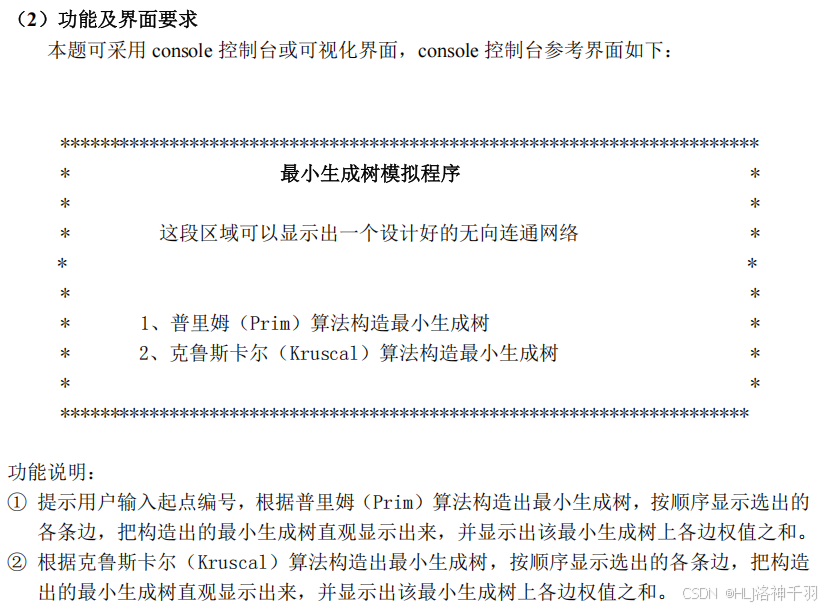 package 实验八;import java.util.Scanner;public class Test {public static void main(String[] args) {Scanner scanner = new Scanner(System.in);PrimTree primTree = new PrimTree();KruskalTree kruskalTree = new KruskalTree();int option;while (true){System.out.println("***********************************************");System.out.println("* 1、普里姆(Prim)算法构造最小生成树 *");System.out.println("* 2、克鲁斯卡尔(Kruskal)算法构造最小生成树 *");System.out.println("* 3、退出 *");System.out.println("************************************************");option=scanner.nextInt();switch (option) {case 1:primTree.t1();continue;case 2:kruskalTree.t2();break;case 3:System.out.println("成功退出!");System.exit(0);default:}}}