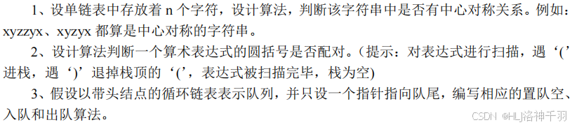 package 实验四.题目一;public class CentrallySymmetric {public static boolean isCentrallySymmetric(LinkedList l) {Stack s = new Stack();Node p = l.getHead();for (int i = 0; i < l.size() / 2; i++) {s.push(p.getData());p = p.getNext();}if (l.size()%2==1){p=p.getNext();}int count=0;for (int i = 0; i < l.size() / 2; i++) {Object pop = s.pop();if (p!=null&&pop.equals(p.getData())){count++;p=p.getNext();}}System.out.println(count);if (count== l.size()/2){return true;}else {return false;}}public static void main(String[] args) {LinkedList l = new LinkedList();l.add("a");l.add("a");l.add("b");l.add("b");l.add("a");l.add("a");boolean b = CentrallySymmetric.isCentrallySymmetric(l);l.linkPrint();System.out.println("是否为中心对称的字符串:");System.out.println(b);}