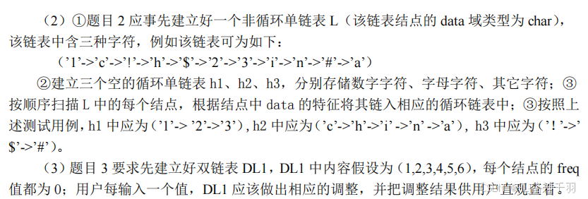 package 实验三.题目二;public class LinkedList2 {private Node head;int size;public LinkedList2() {this.head = new Node('0', null);this.size = 0;}public void create(Node head, int len) {head = new Node();Node p = head;if (len == 1) {p.setData('\0');} else {for (int i = 0; i < len; i++) {if (i < len - 1) {p.setNext(new Node());p = p.getNext();}if (i == len - 1) {p.setNext(head);}}}}public void insert(char t) {Node n = head;while (n.getNext() != null) {n = n.getNext();}Node newNode = new Node(t, null);n.setNext(newNode);size++;}public Node get(int i) {Node p = head;for (int index = 0; index < i; index++) {p = p.getNext();}return p;}public void linkPrint() {Node p = head.getNext();if (head != null) {while (p.getNext() != null) {System.out.print(p.getData() + " ");p = p.getNext();}System.out.print(p.getData() + " ");System.out.println();} else {System.out.println("链表中没有数据!!!");}}public void result() {Node current = head;LinkedList2 a1 = new LinkedList2();LinkedList2 a2 = new LinkedList2();LinkedList2 a3 = new LinkedList2();while (current != null) {if ((current.getData() >= 'A' && current.getData() <= 'Z') || (current.getData() >= 'a' && current.getData() <= 'z')) {a1.insert(current.getData());} else if (current.getData() >= '0' && current.getData() <= '9') {a2.insert(current.getData());} else {a3.insert(current.getData());}current = current.getNext();}System.out.print("字母:");a1.linkPrint();System.out.print("数字:");a2.linkPrint();System.out.print("符号:");a3.linkPrint();}public static void main(String[] args) {LinkedList2 l = new LinkedList2();l.insert('1');l.insert('2');l.insert('a');l.insert('e');l.insert('f');l.insert('b');l.insert('5');l.insert('c');l.insert('7');l.insert('9');l.insert('d');l.insert('e');l.insert('@');l.insert('#');l.insert('$');l.insert('%');l.insert('^');l.insert('&');l.insert('*');l.insert('?');l.create(l.head, 20);l.linkPrint();l.result();}