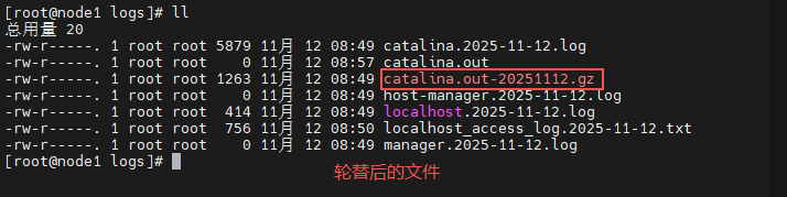 3.2 执行命令后, 需要查看日志文件, 观察tomcat的日志是否触发轮替操作, 形成了新的轮替文件![]()