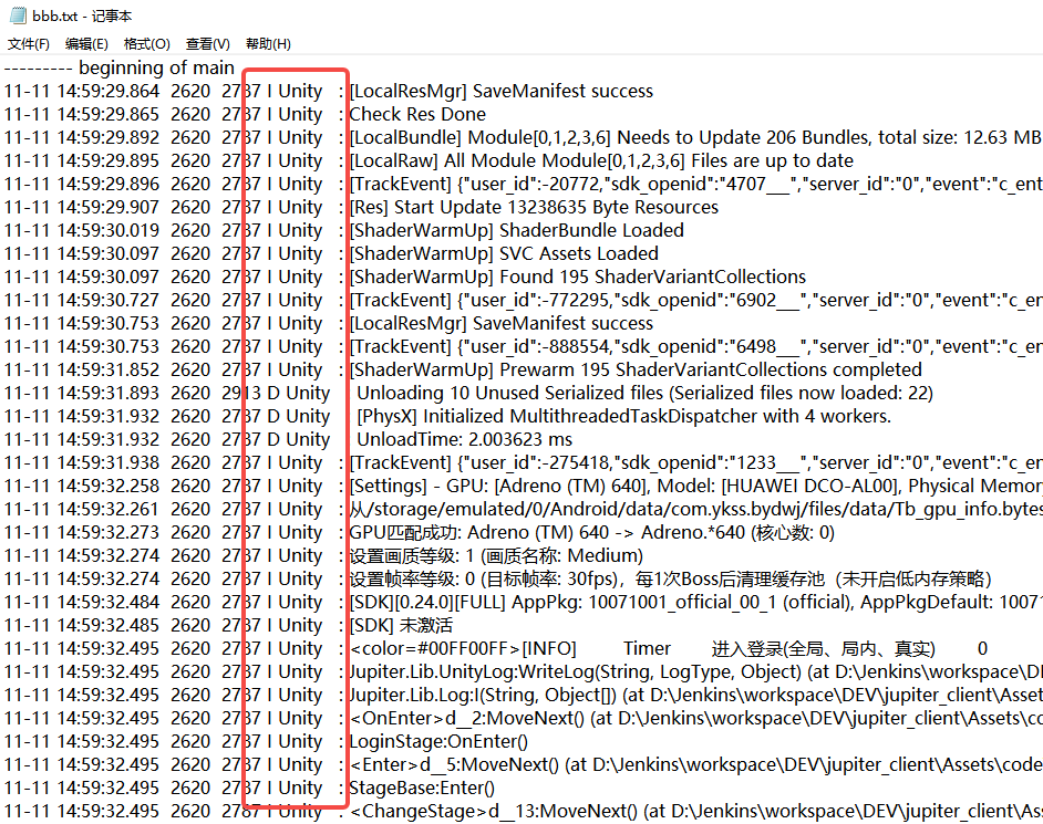 adb logcat -s unity > log.txt但是只有核心代码还不行,你只执行adb logcat的话会把所有日志输出到cmd里,很显然我们需要保存到文本文件里查看,那么你可以使用adb logcat > log.txt指令