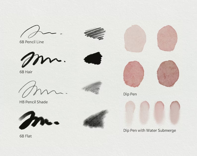 核心搭配:Dip Pen + Water Submerge + Sketch Book Paper Texture。先用 Dip Pen 勾勒主体轮廓,再用 Water Submerge 蘸取淡色晕染,让线条和色彩自然融合,最后添加纸张纹理增强质感。我用这个搭配画花卉主题素描时,既有素描的线条感,又有水墨的晕染效果,风格独特又好看。
