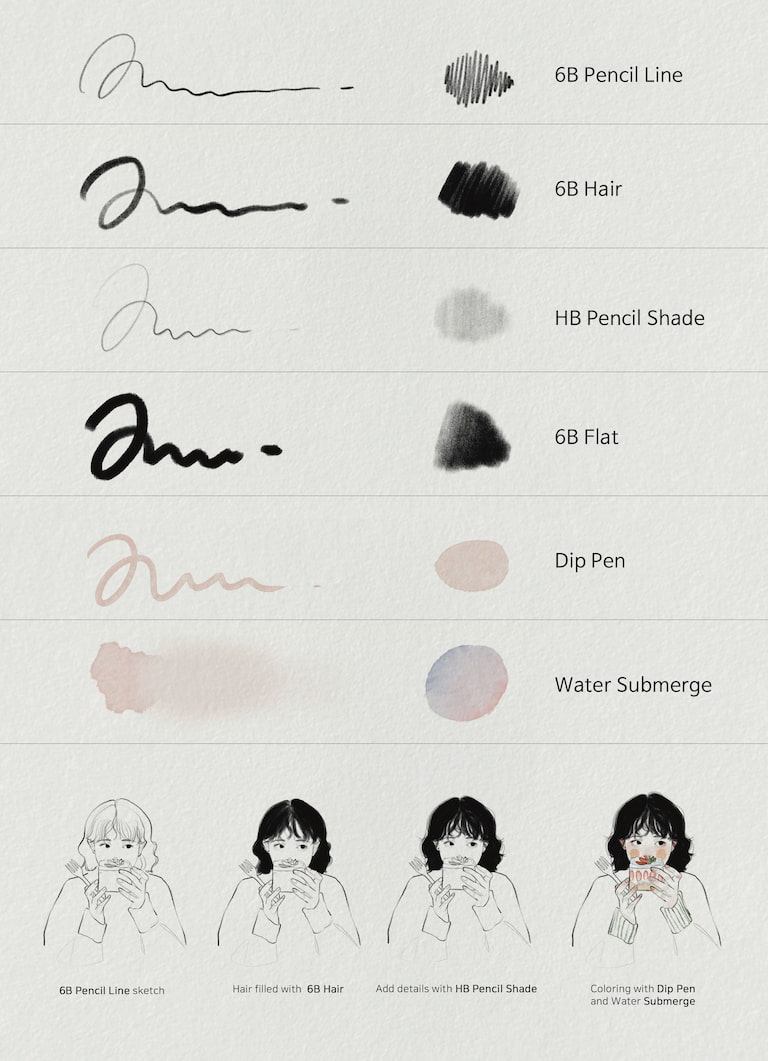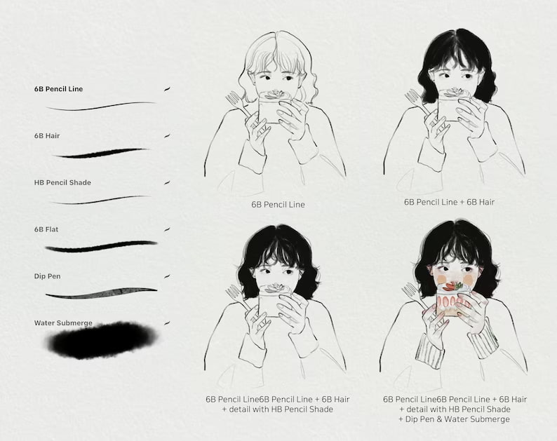 核心搭配:6B Pencil Line + HB Pencil Shade + 6B Hair + Sketch Book Paper Texture。先用 6B Pencil Line 勾勒人物轮廓和动态,再用 HB Pencil Shade 塑造脸部、身体的体积感,头发用 6B Hair 分层绘制,最后添加纸张纹理。我用这套搭配画打伞的女孩时,人物的神态、头发的层次和画面的质感都很到位,完全满足素描风人物插画的创作需求。