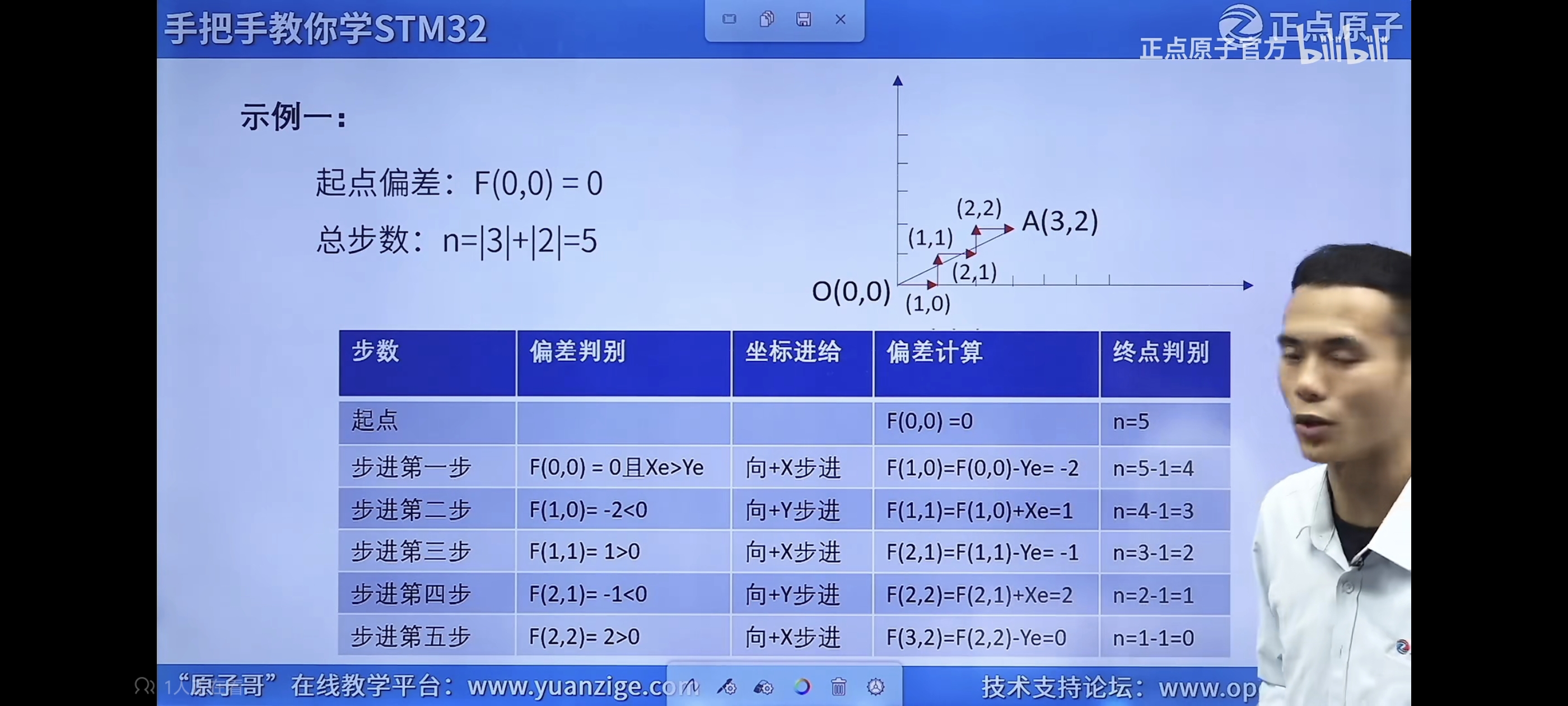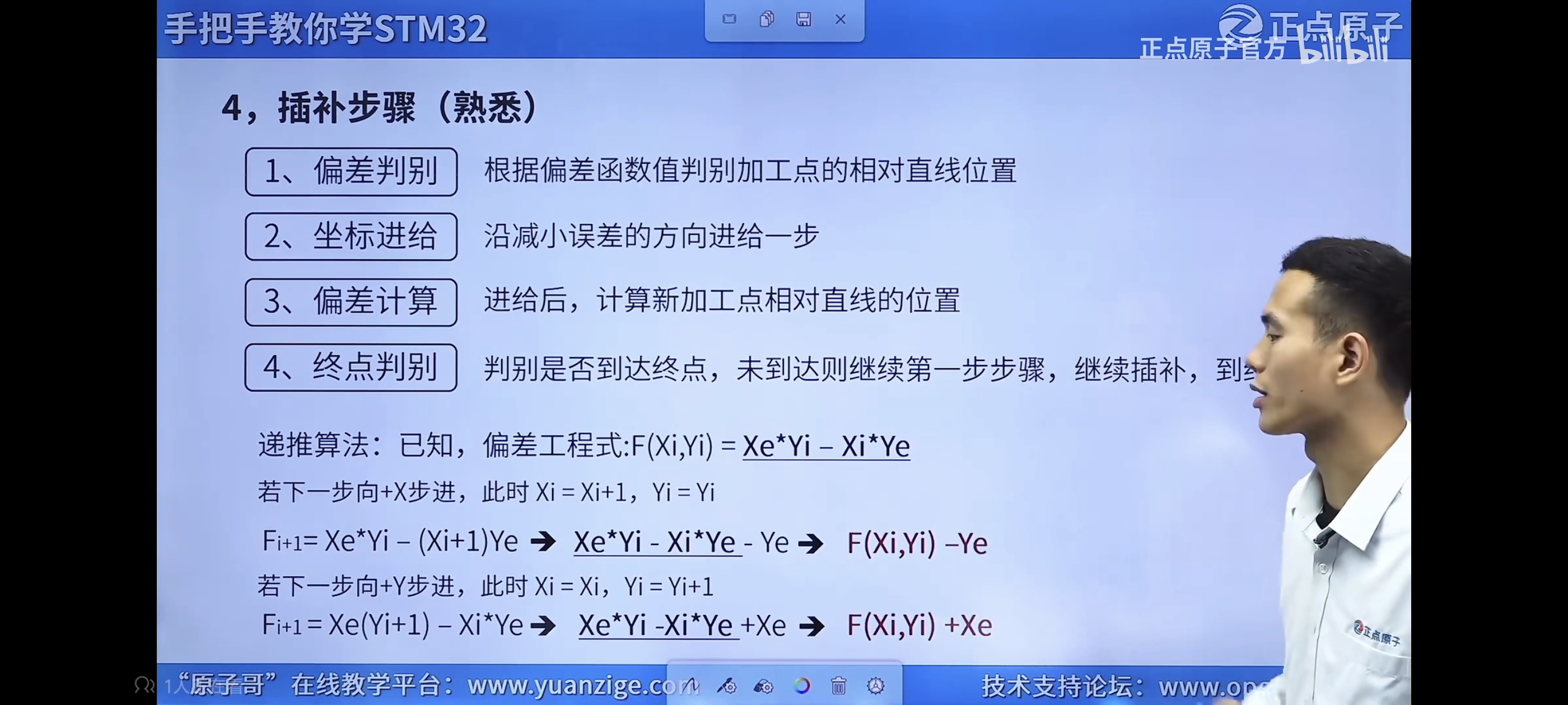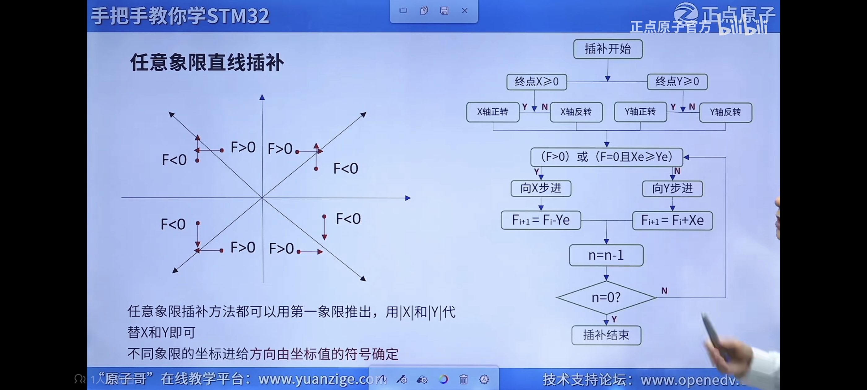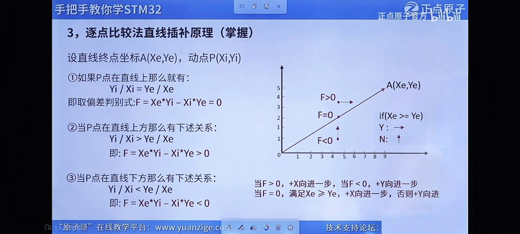 终点判别:将终点位置的x,y坐标相加求和,得出总步数,开始插补时,无论是给哪个轴给进一步,总步数都减一,直到为0时,代表已到达终点,就停止插补;
