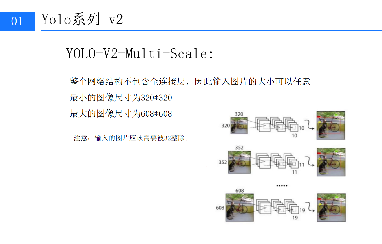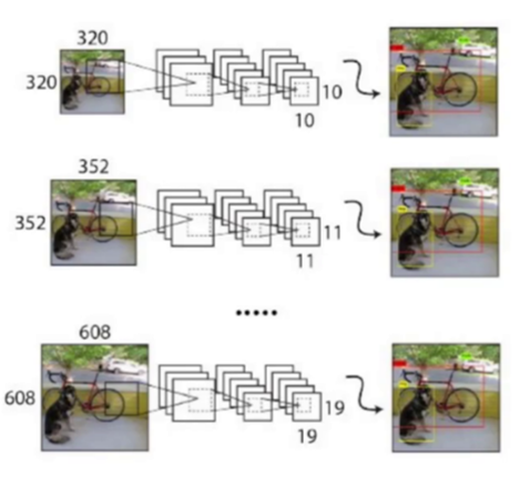 目标检测的应用场景千差万别:监控摄像头可能输出416×416的图像,无人机航拍可能是1024×1024的大图,手机拍摄则可能是320×320的小图。传统检测算法通常固定输入尺寸,导致在非标准输入下性能骤降。YOLOv2通过多尺度训练与动态输入支持,彻底解决了这一问题。(此处第5张图:标题为“YOLO-V2-Multi-Scale”的网络结构说明,标注输入尺寸320×320、352×352、608×608的示例)